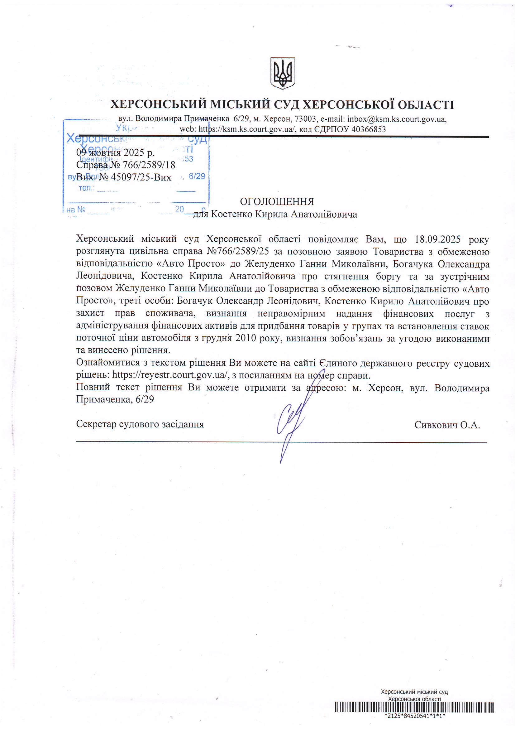 Оголошення для Костенка Кирила Анатолійовича про винесення рішення