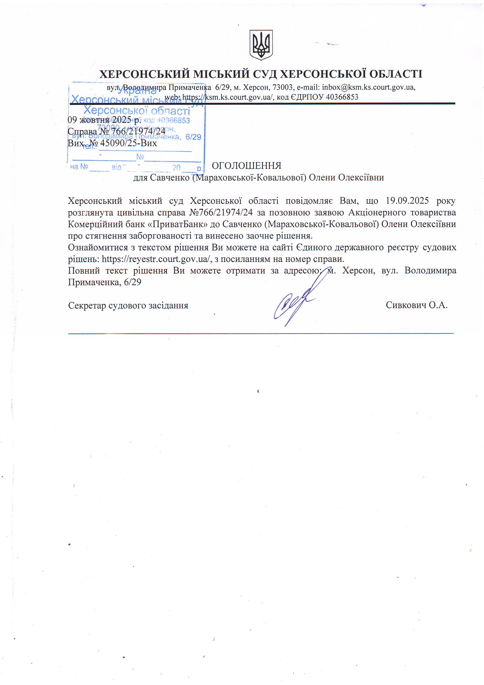 Оголошення для Савченко (Мараховської-Ковальової) Олени Олексіївни про винесення заочного рішення