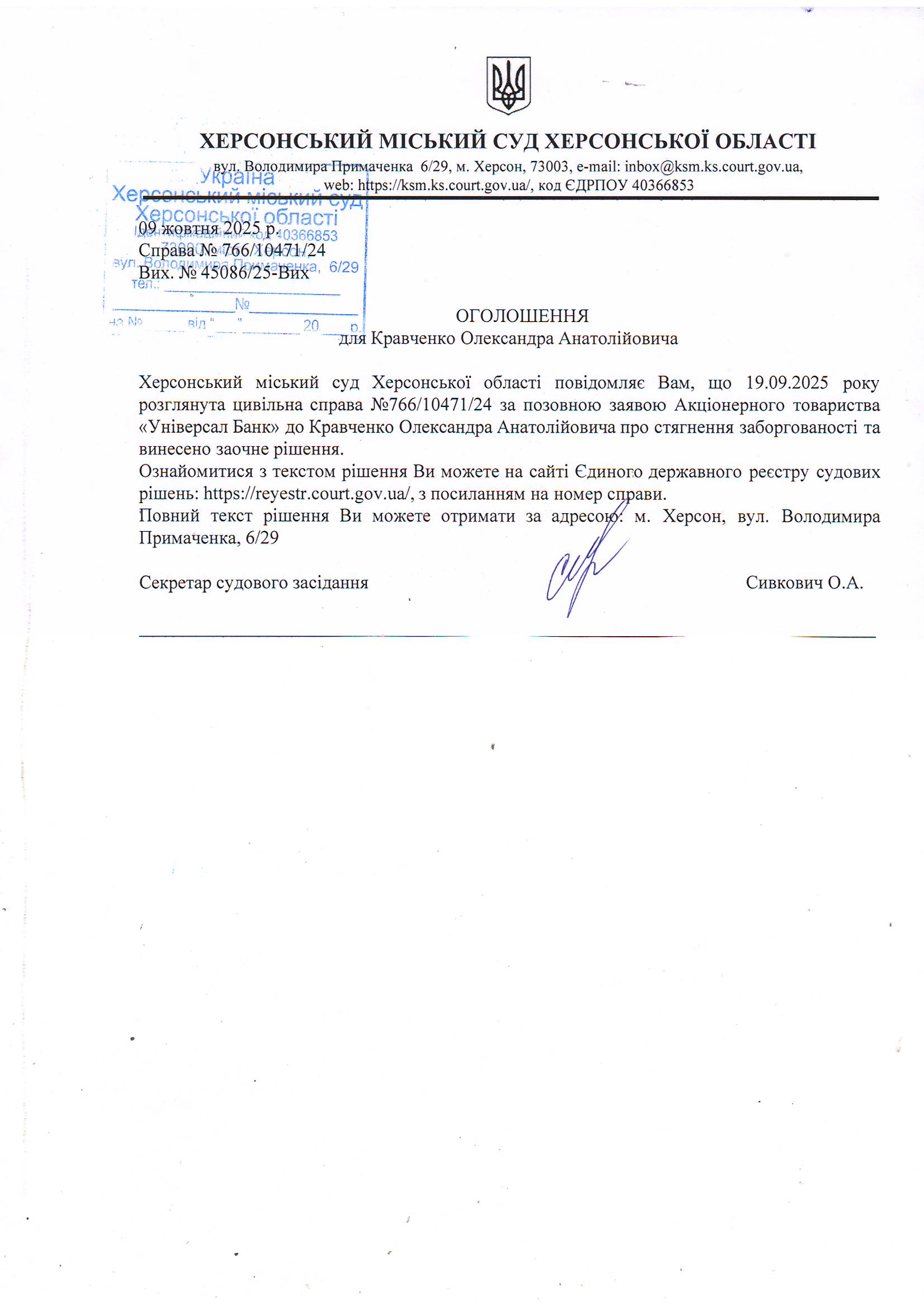 Оголошення для Кравченка Олександра Анатолійовича про винесення заочного рішення