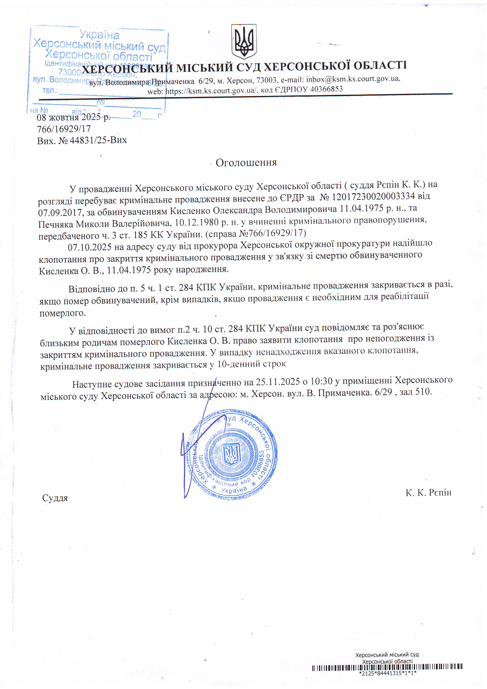 Оголошення про закриття кримінального провадження у відношенні Кисленка Олександра Володимировича