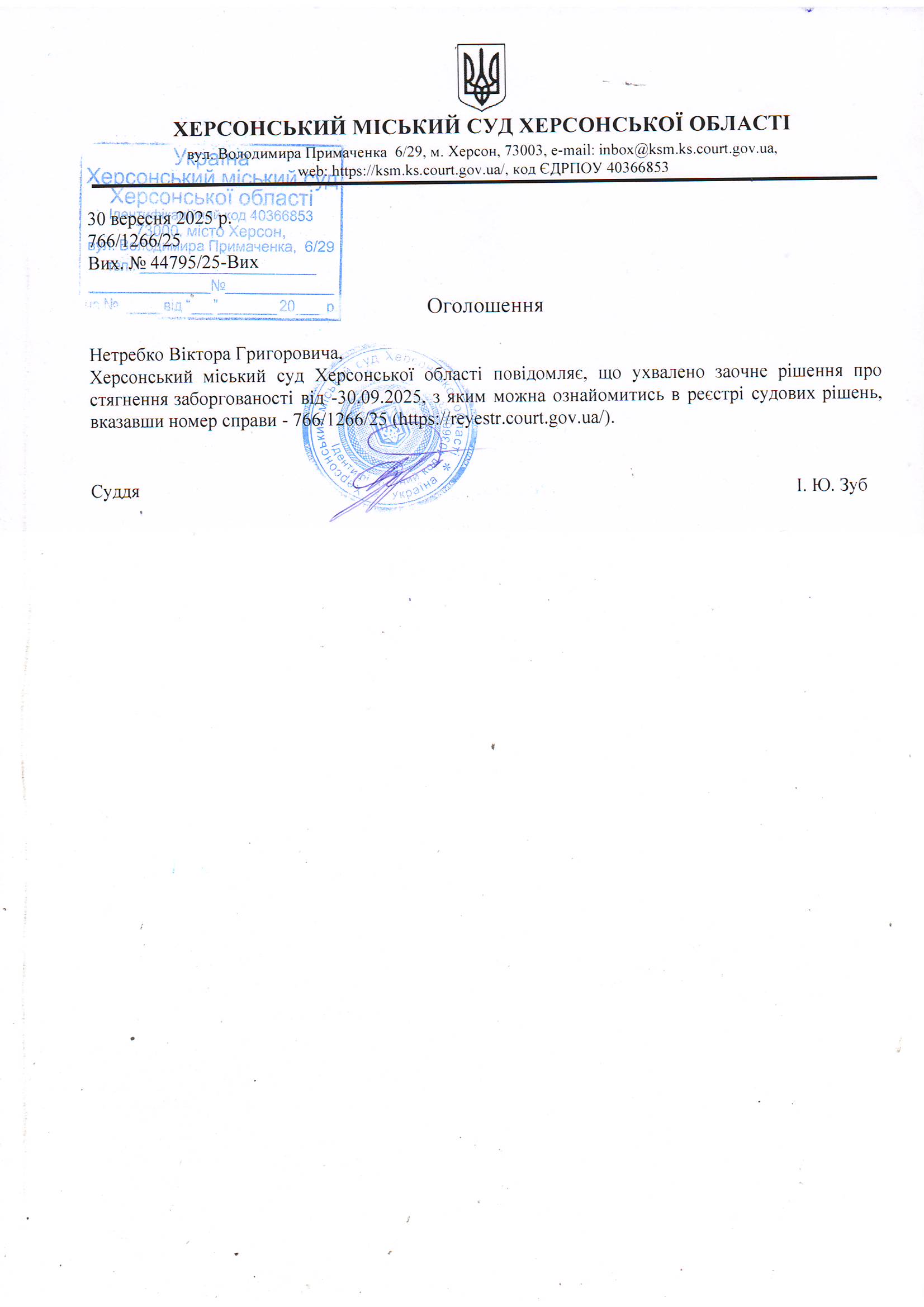 Оголошення для Нетребка Віктора Григоровича про ухвалення заочного рішення