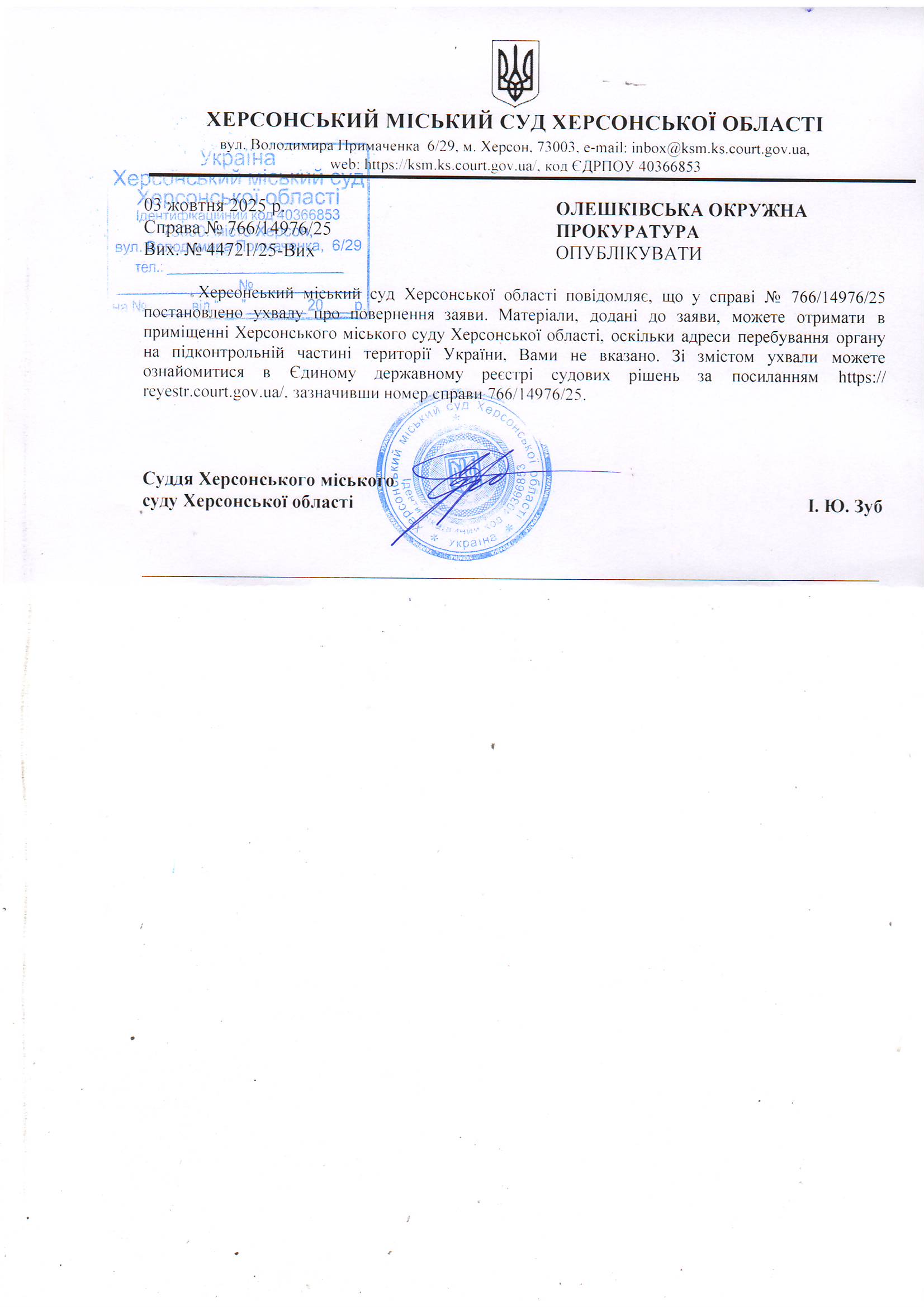 Оголошення для Олешківської окружної прокуратури про постановлення ухвали