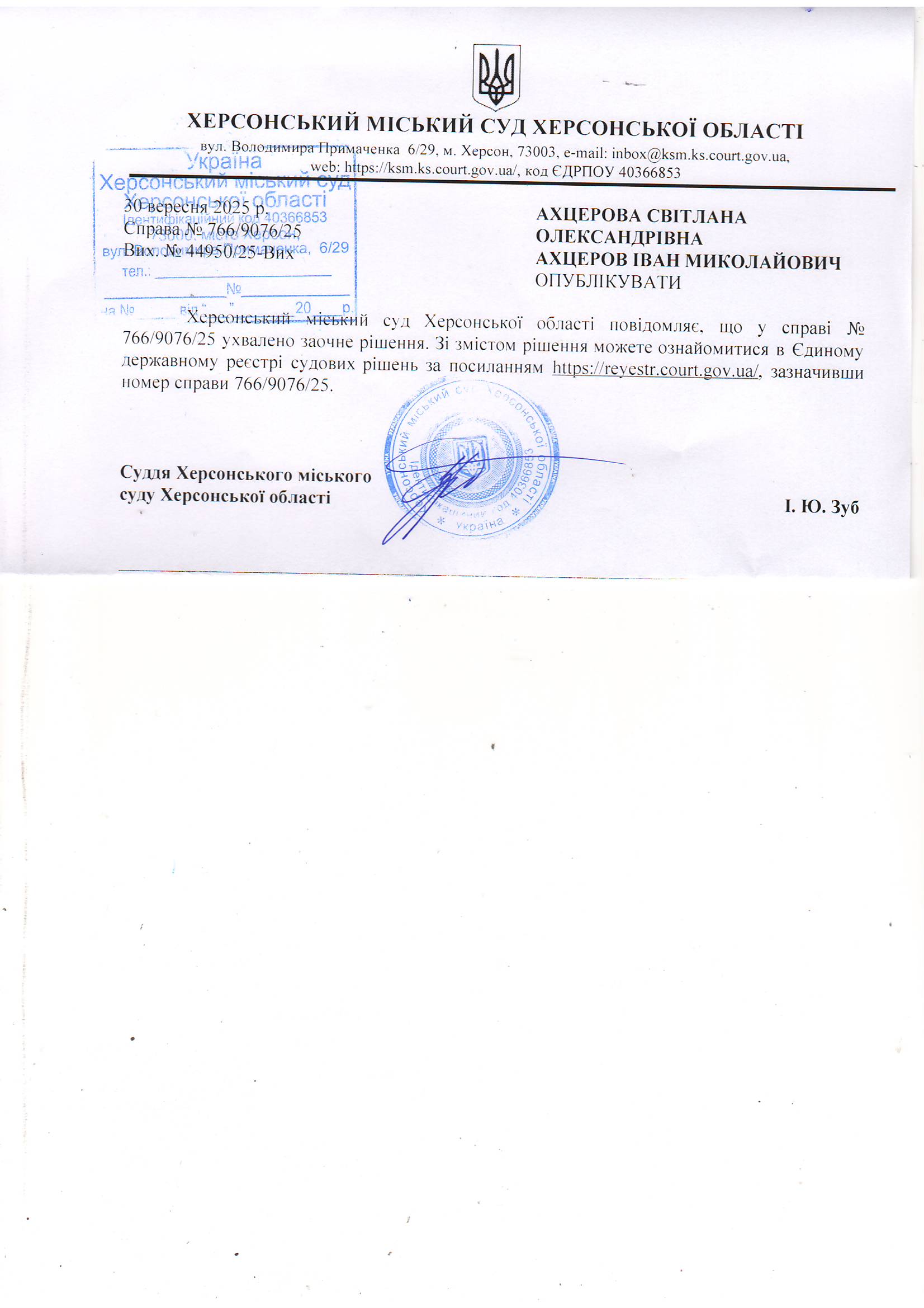 Оголошення для Ахцерової Світлани Олександрівни, Ахцерова Івана Миколайовича про ухвалення заочного рішення