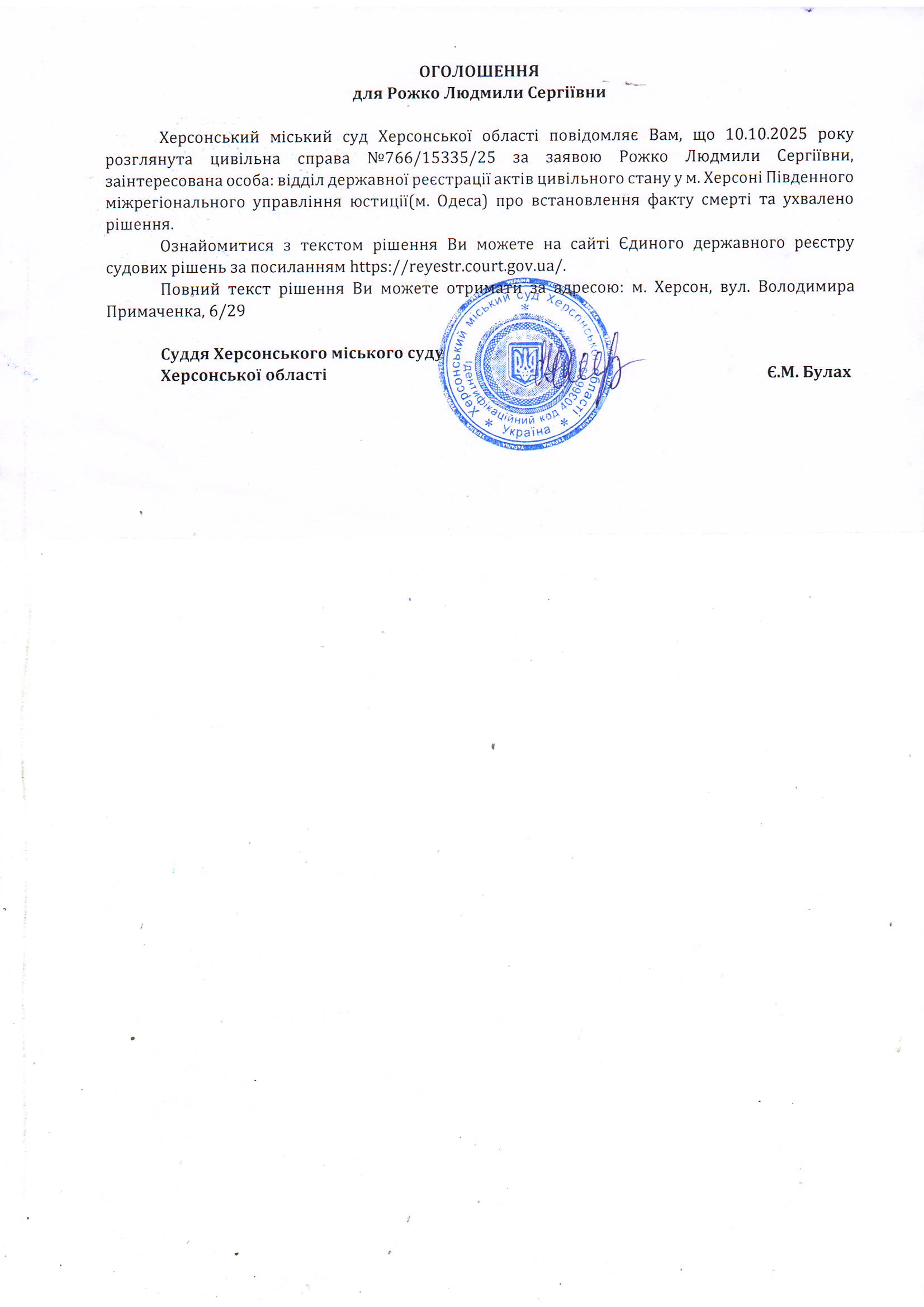 Оголошення для Рожко Людмили Сергіївни про ухвалення рішення