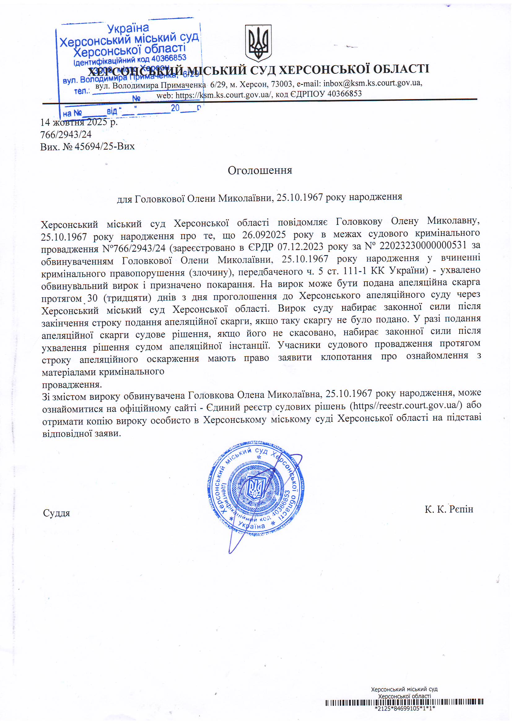 Оголошення для Головкової Олени Миколаївни про ухвалення вироку