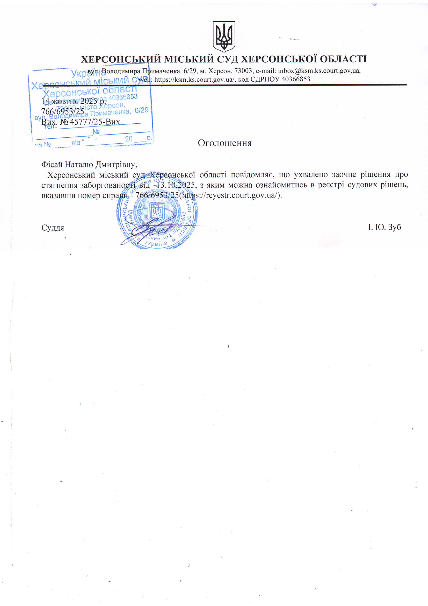 Оголошення для Фісай Наталі Дмитрівни про ухвалення заочного рішення