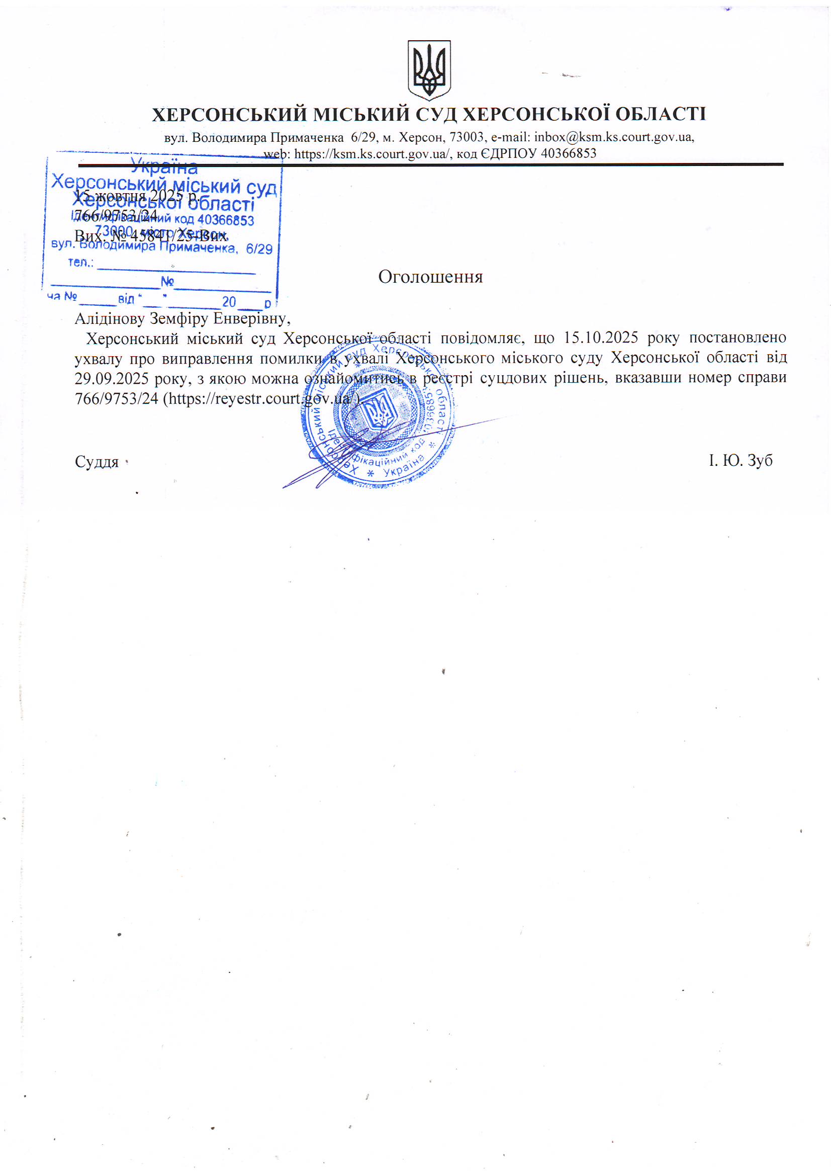 Оголошення для Алідінової Земфіри Енверівни про постановлення ухвали