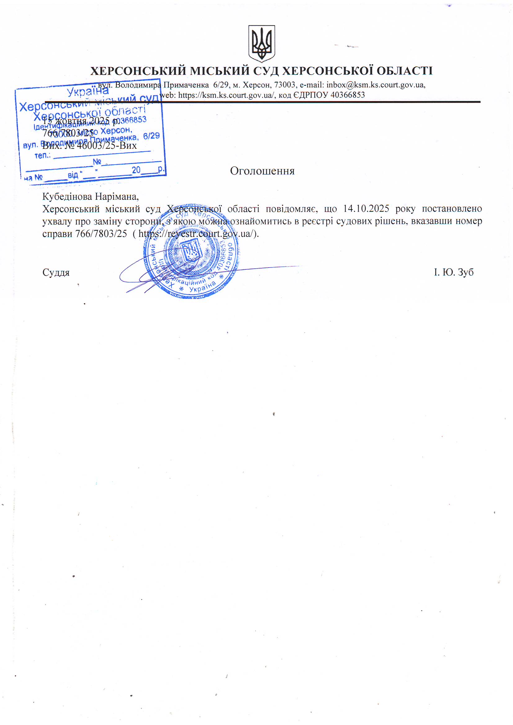 Оголошення для Кубедінова Нарімана про постановлення ухвали