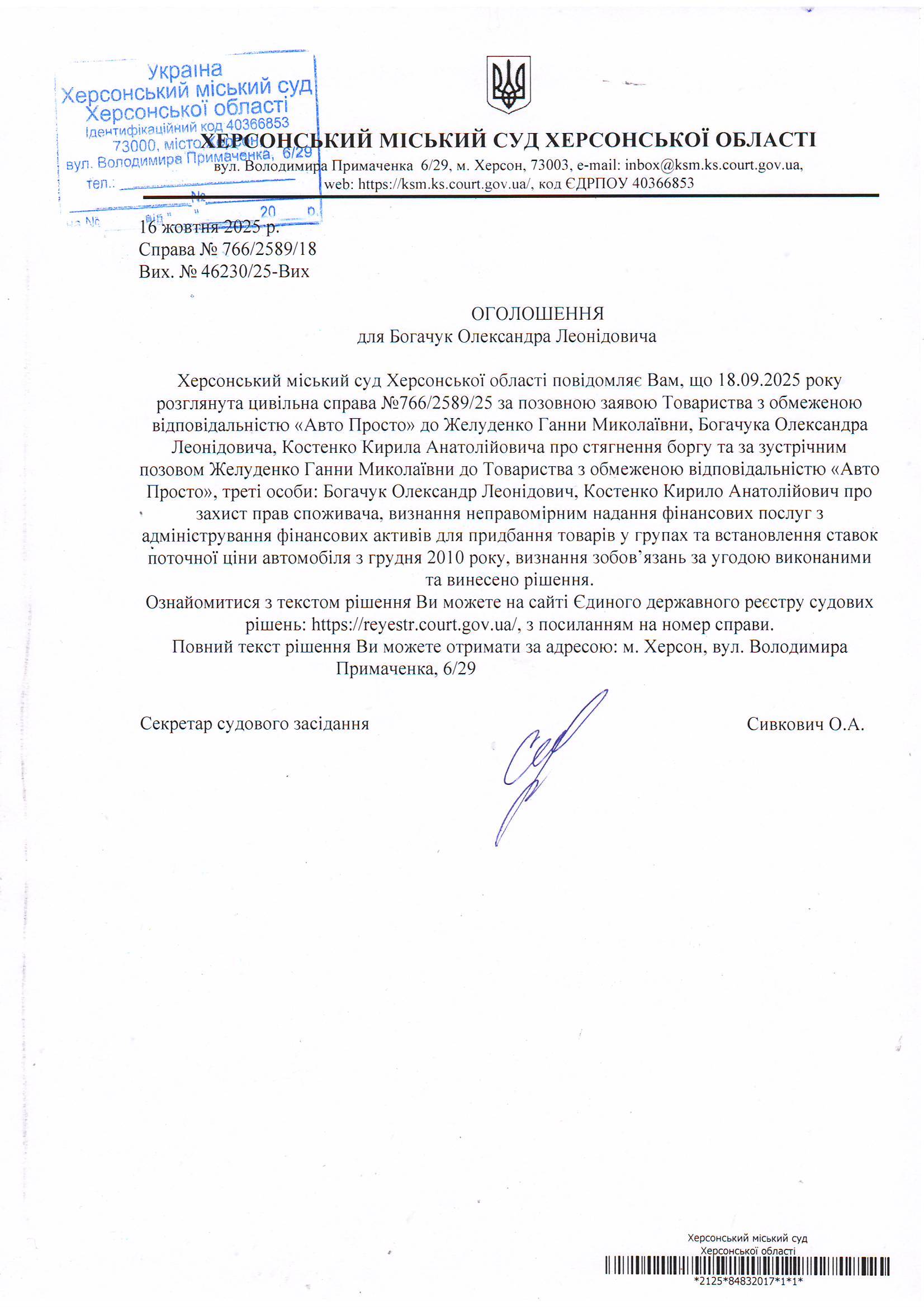 Оголошення для Богачука Олександра Леонідовича про винесення рішення