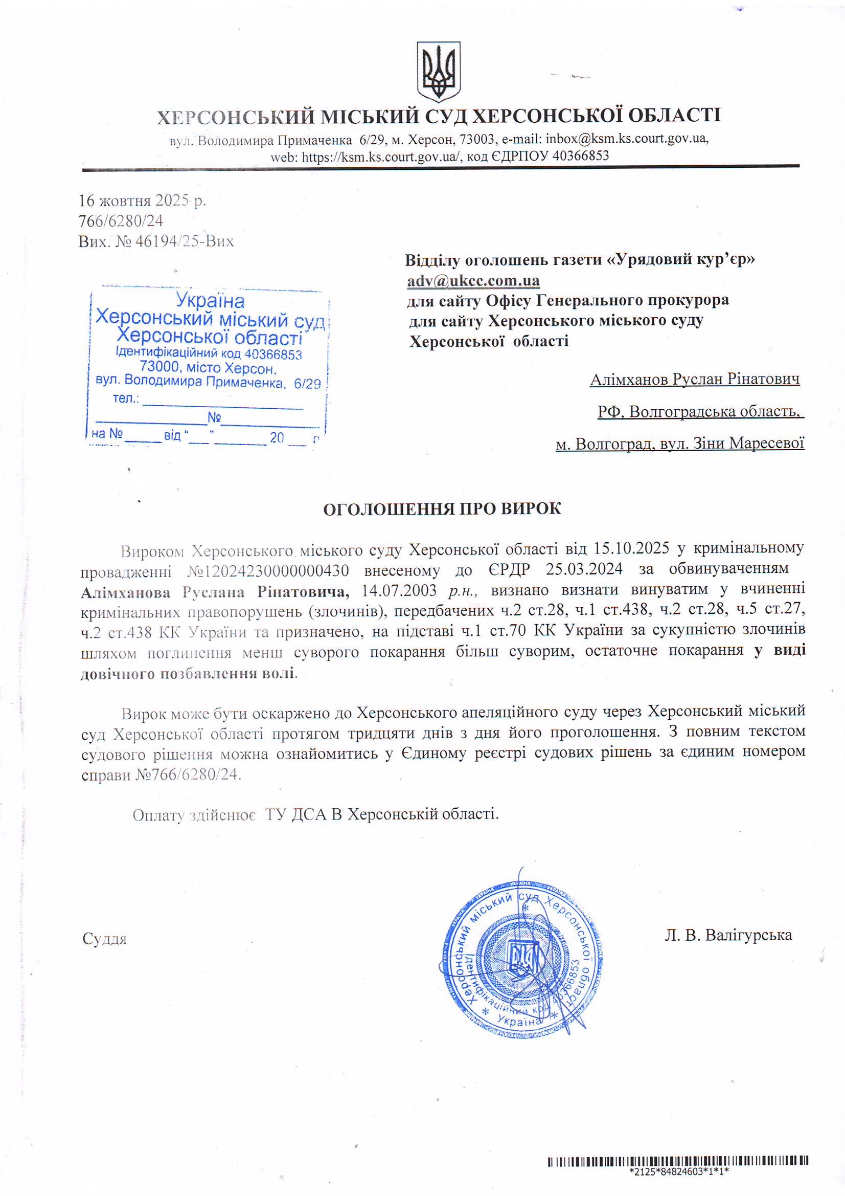 Оголошення для Алімханова Руслана Рінатовича про ухвалення вироку