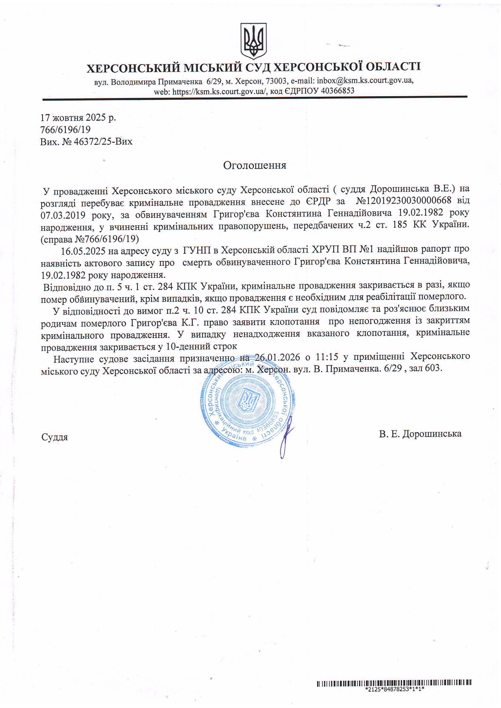 Оголошення про закриття кримінального провадження у відношенні Григор'єва Костянтина Геннадійовича