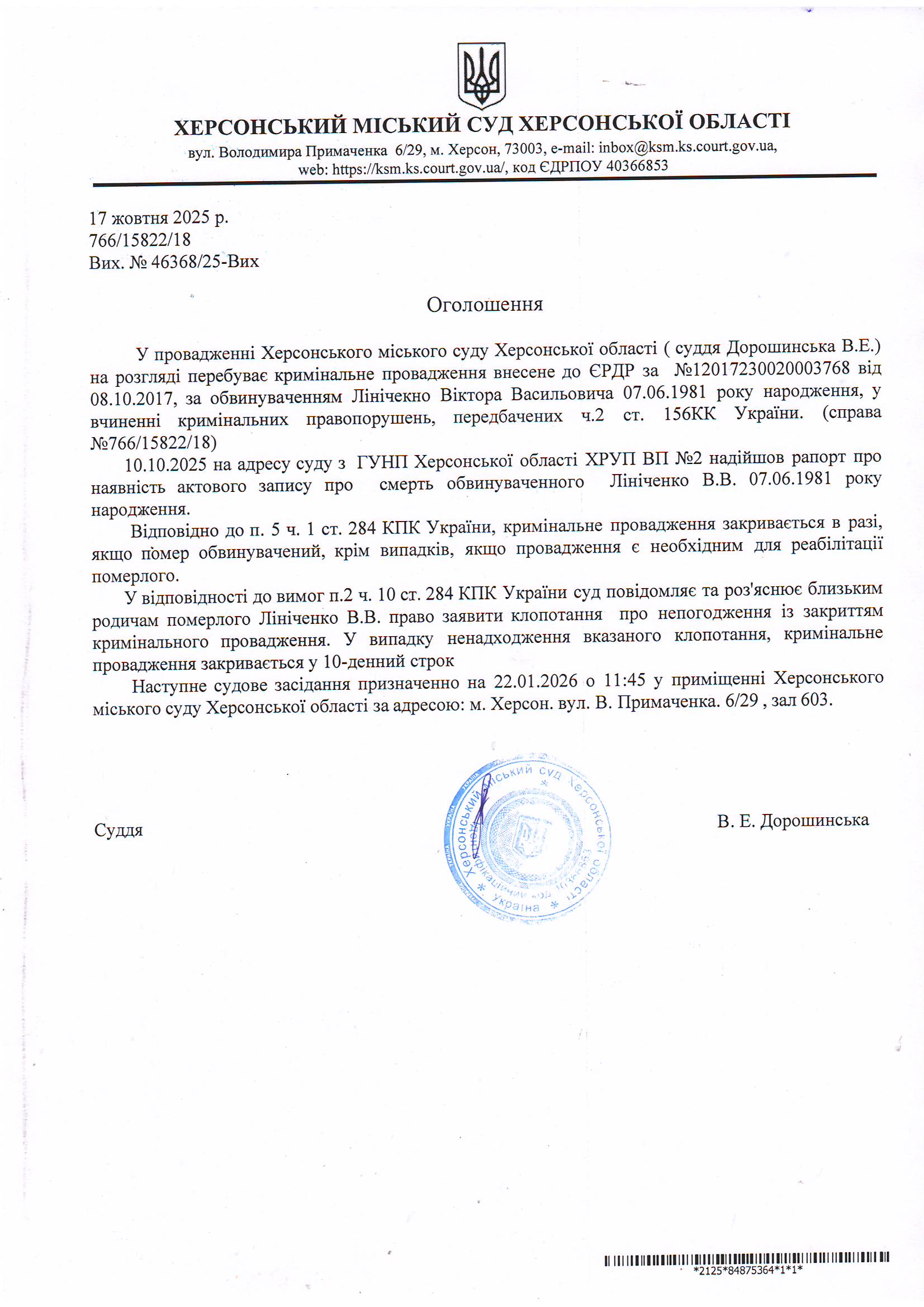 Оголошення про закриття кримінального провадження у відношенні Лініченка Віктора Васильовича