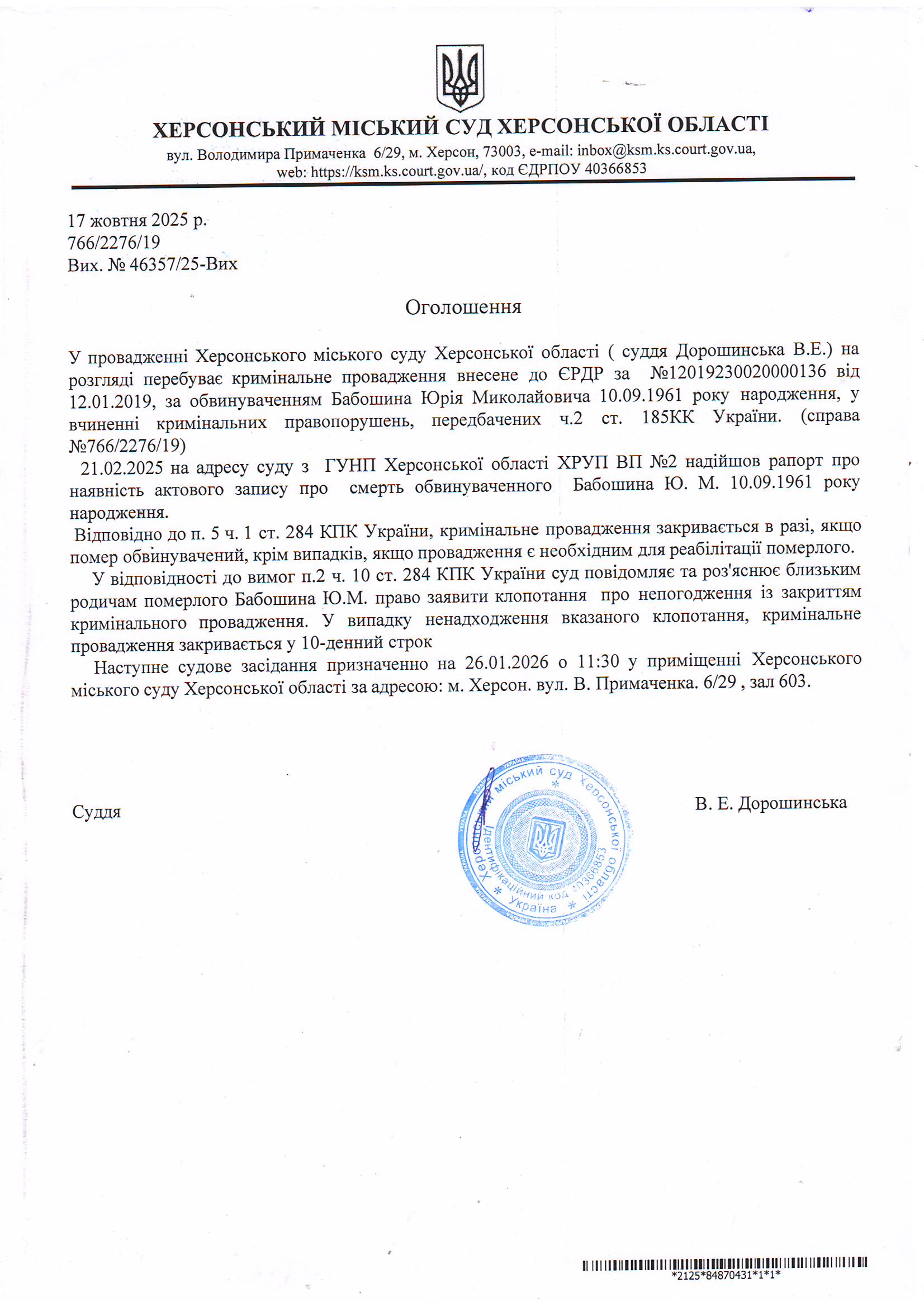 Оголошення про закриття кримінального провадження у відношенні Бабошина Юрія Миколайовича
