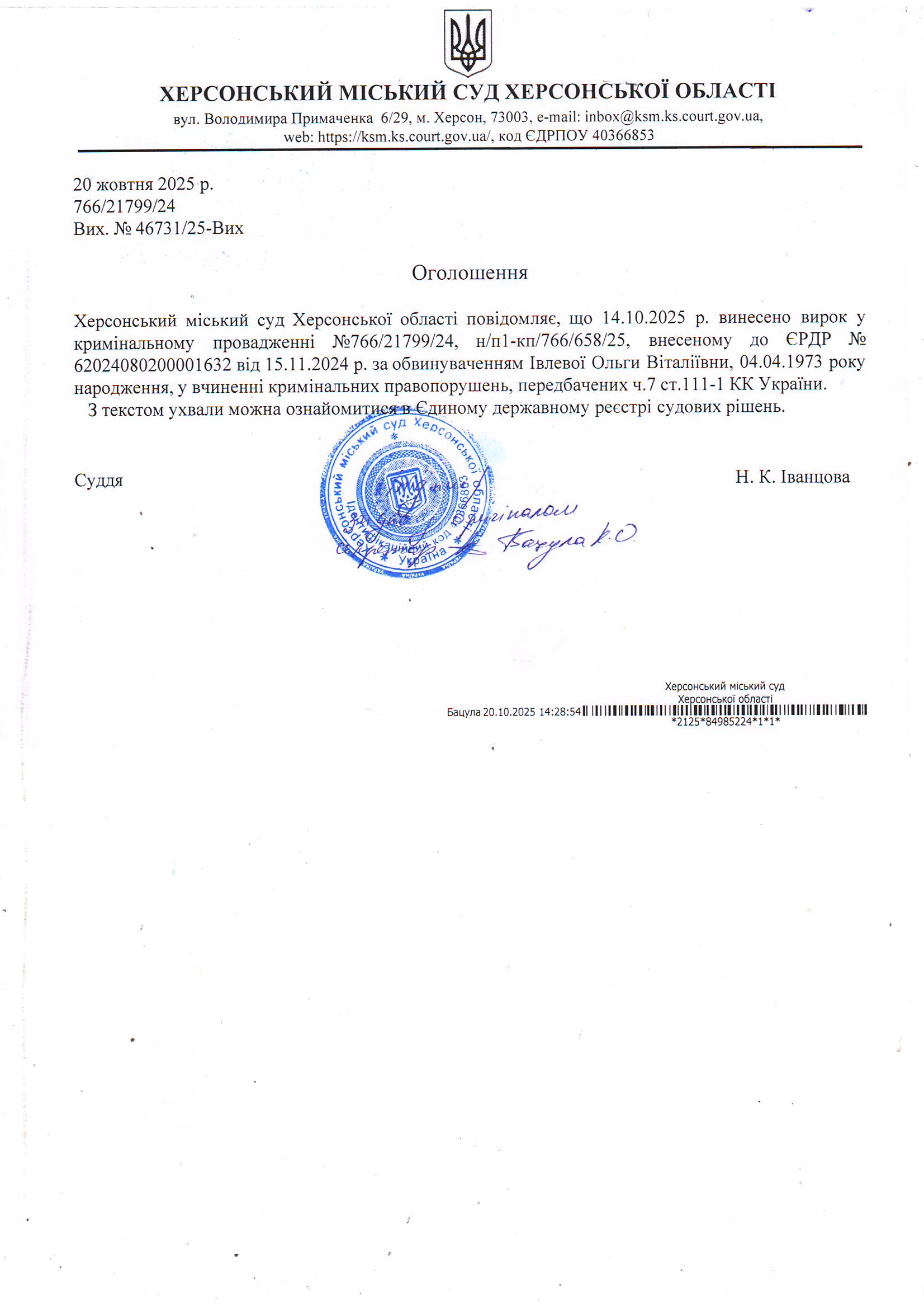 Оголошення для Івлевої Ольги Віталіївни про винесення вироку