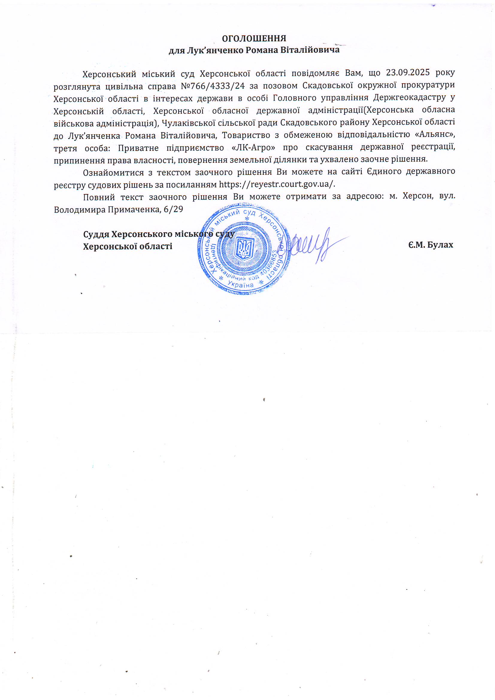 Оголошення для Лук'янченка Романа Віталійовича про ухвалення заочного рішення
