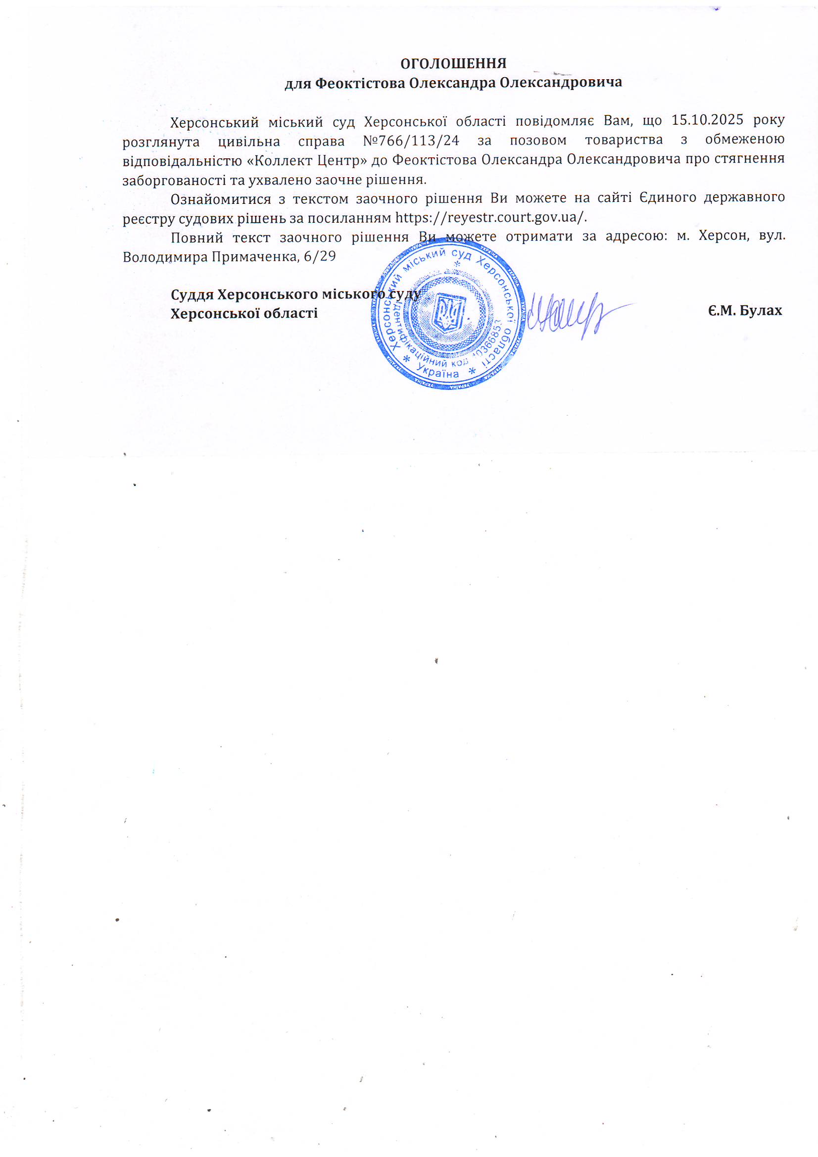 Оголошення для Феоктістова Олександра Олександровича про ухвалення заочного рішення