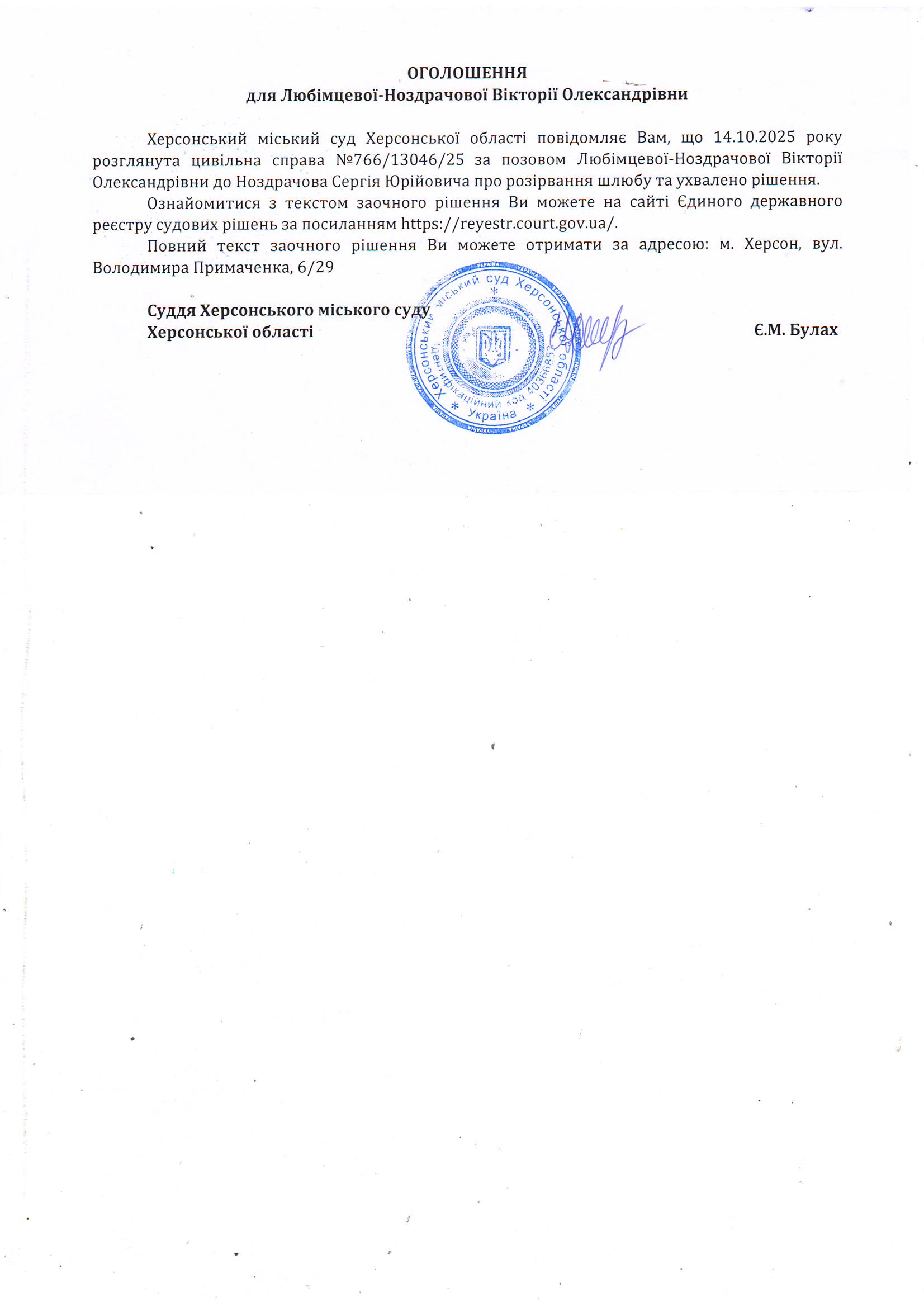 Оголошення для Любімцевої-Ноздрачової Вікторії Олександрівни про ухвалення рішення