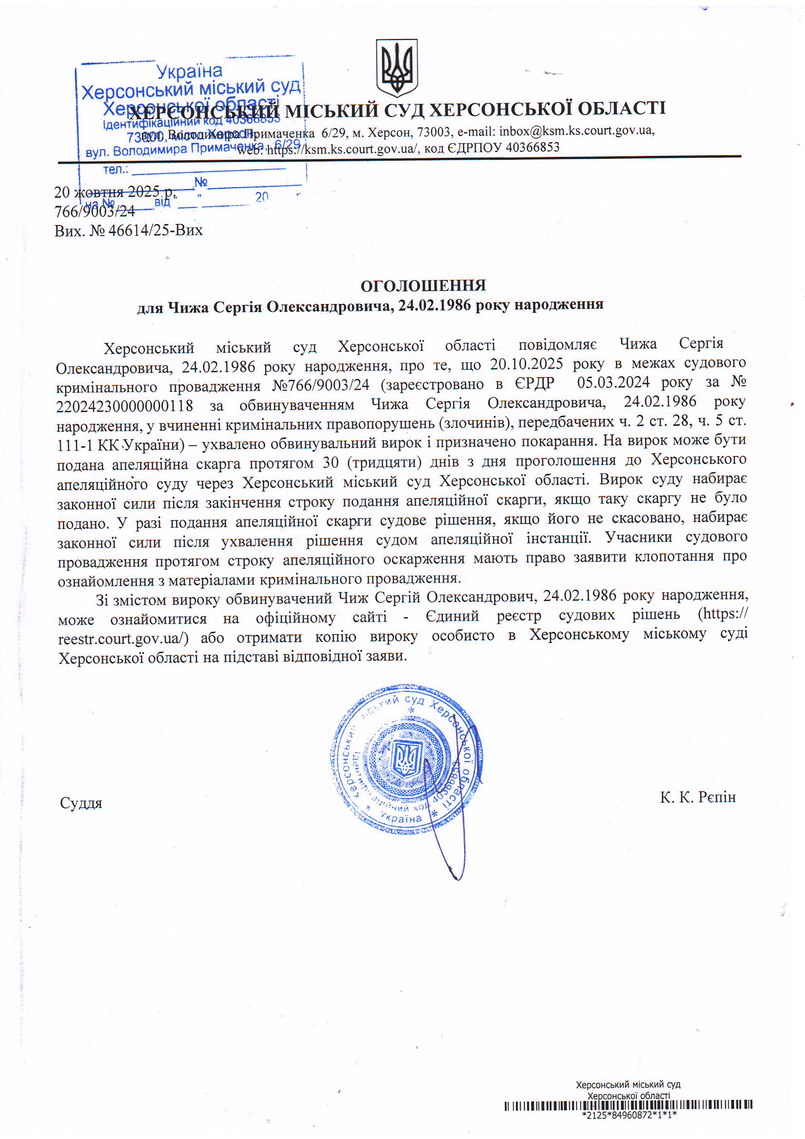 Оголошення для Чижа Сергія Олександровича про винесення вироку