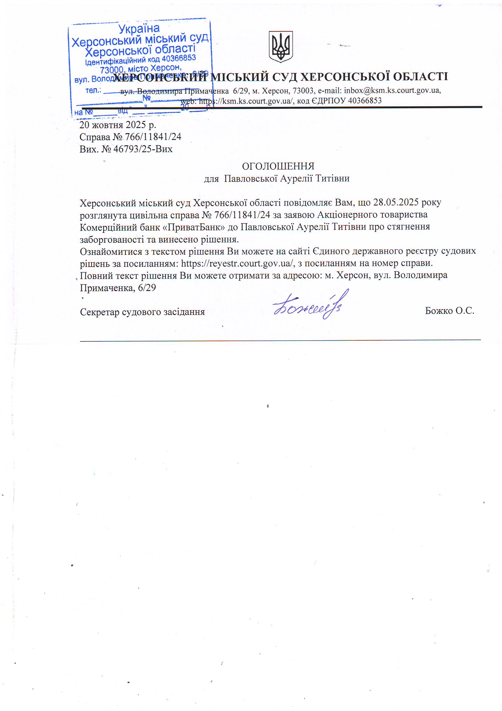 Оголошення для Павловської Аурелії Титівни про винесення рішення