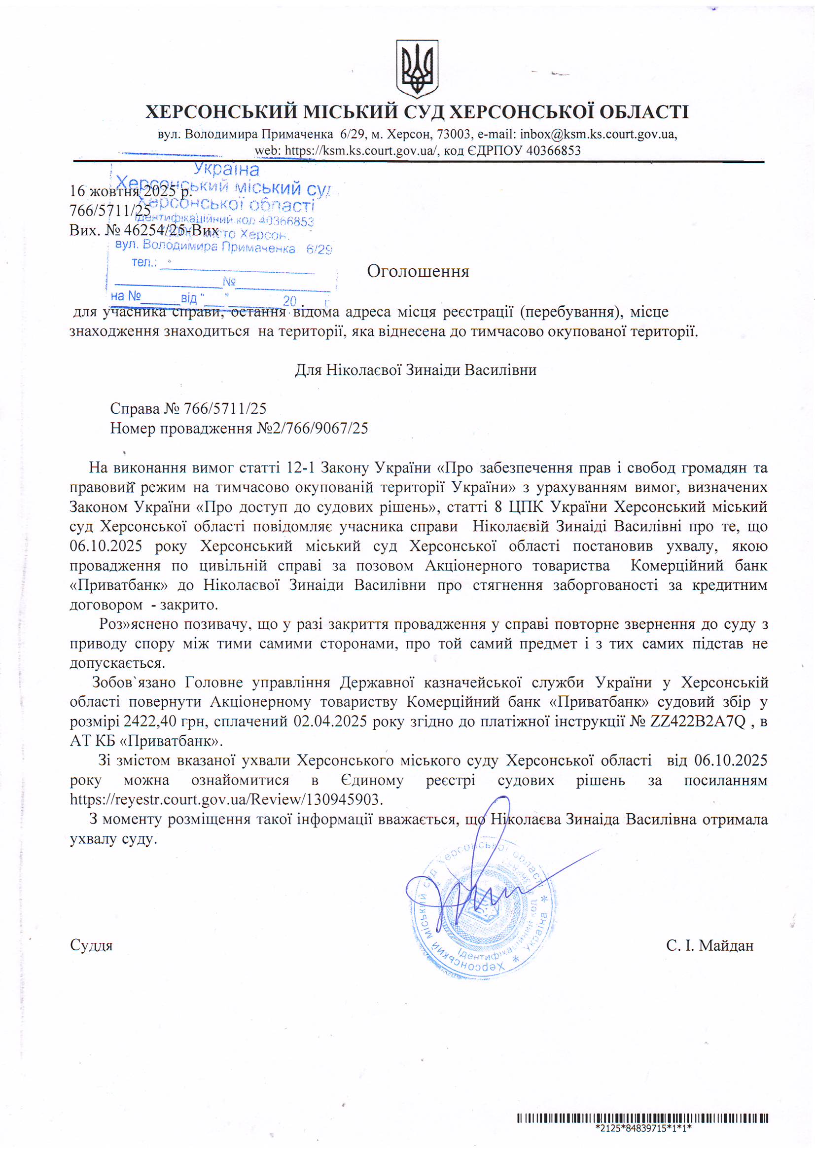 Оголошення для Ніколаєвої Зинаіди Василівни про постановлення ухвали