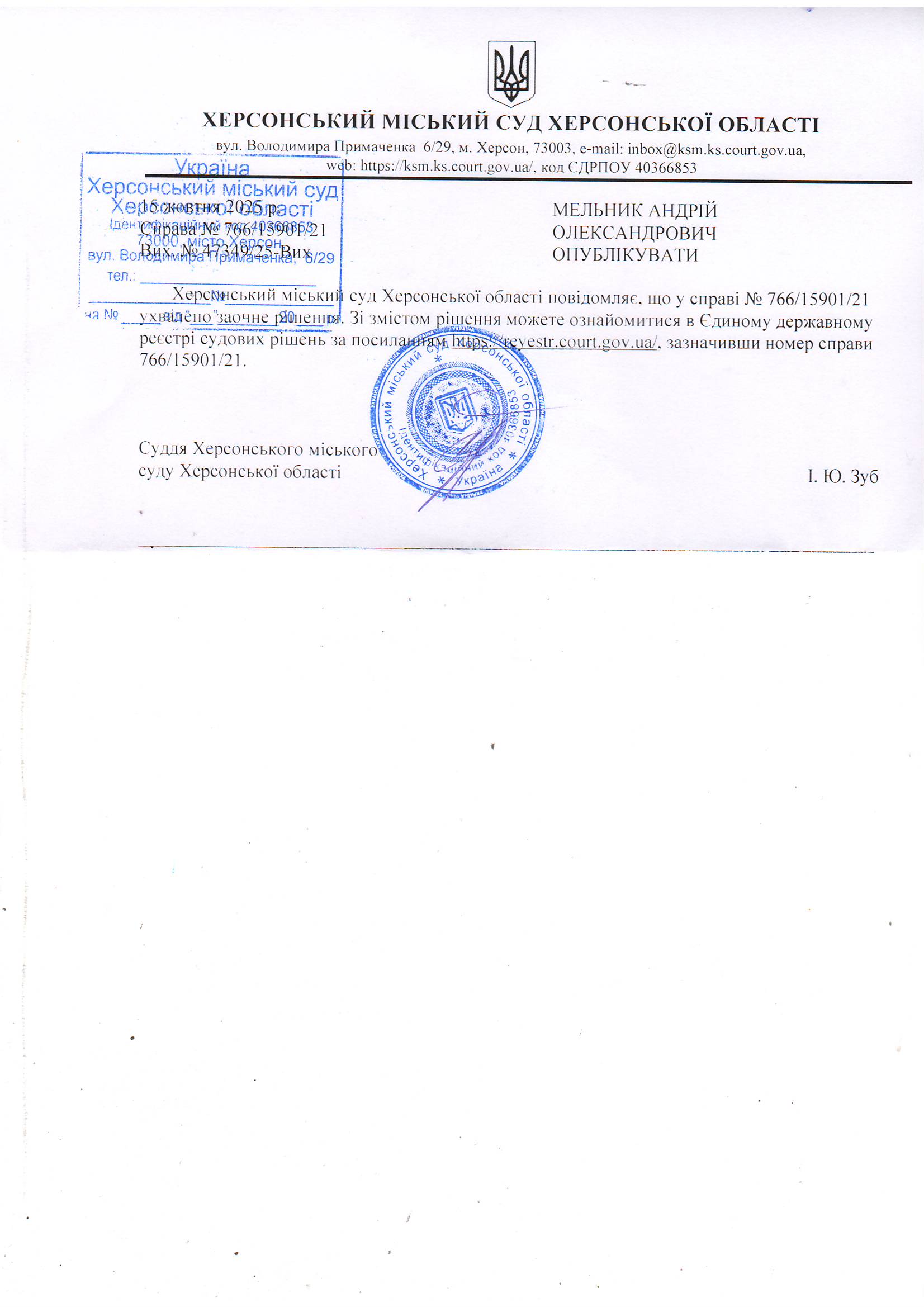 Оголошення для Мельника Андрія Олександровича про ухвалення заочного рішення