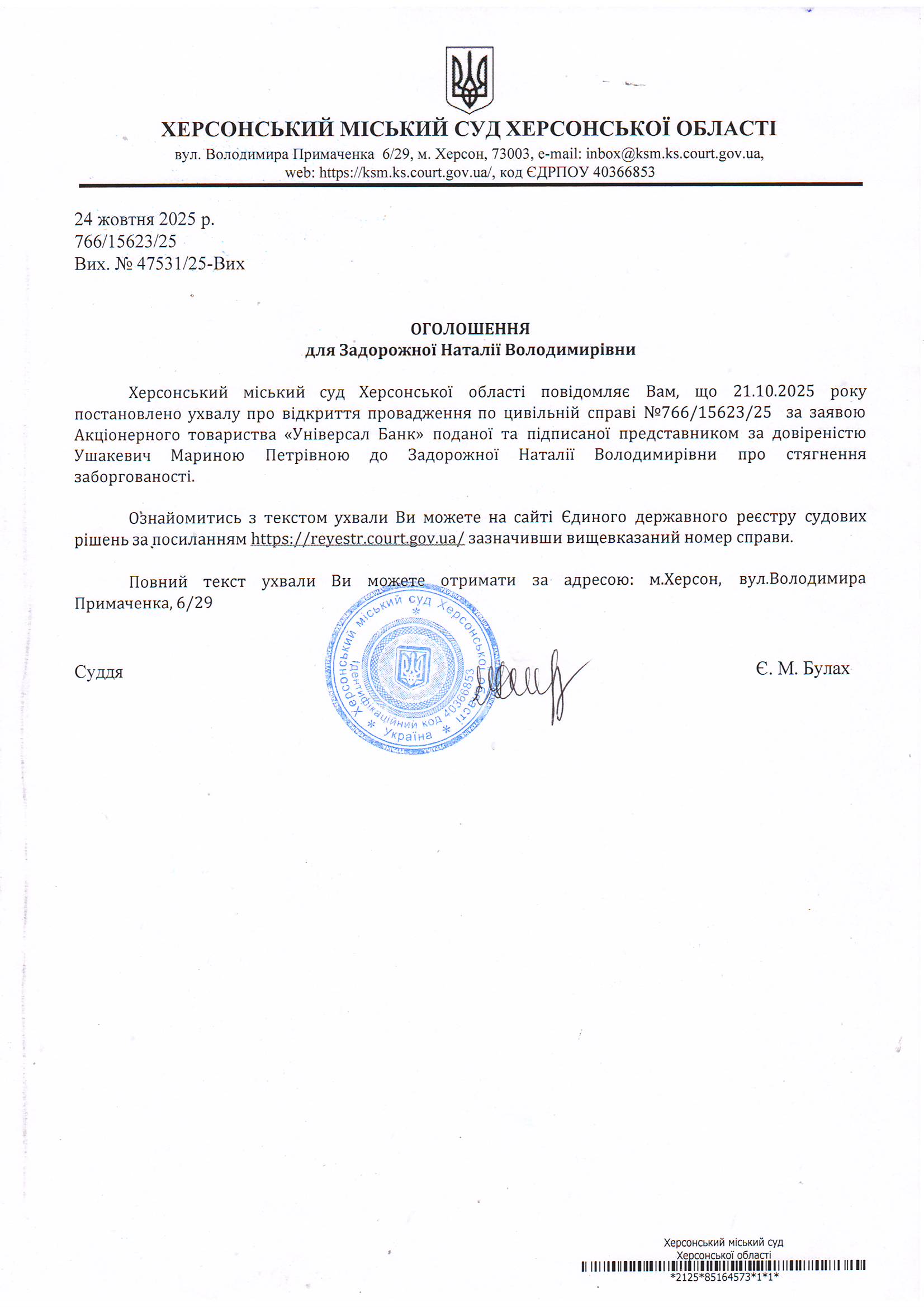 Оголошення для Задорожної Наталії Володимирівни про постановлення ухвали