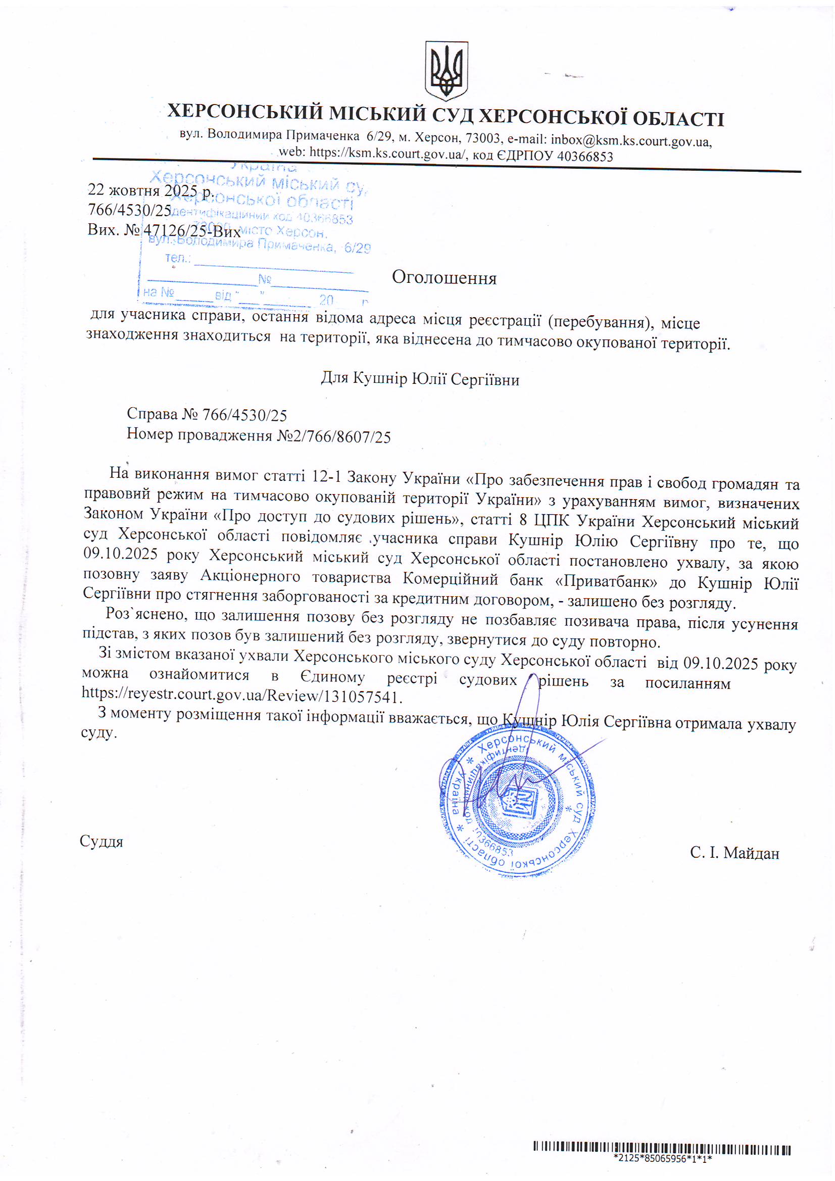 Оголошення для Кушнір Юлії Сергіївни про постановлення ухвали