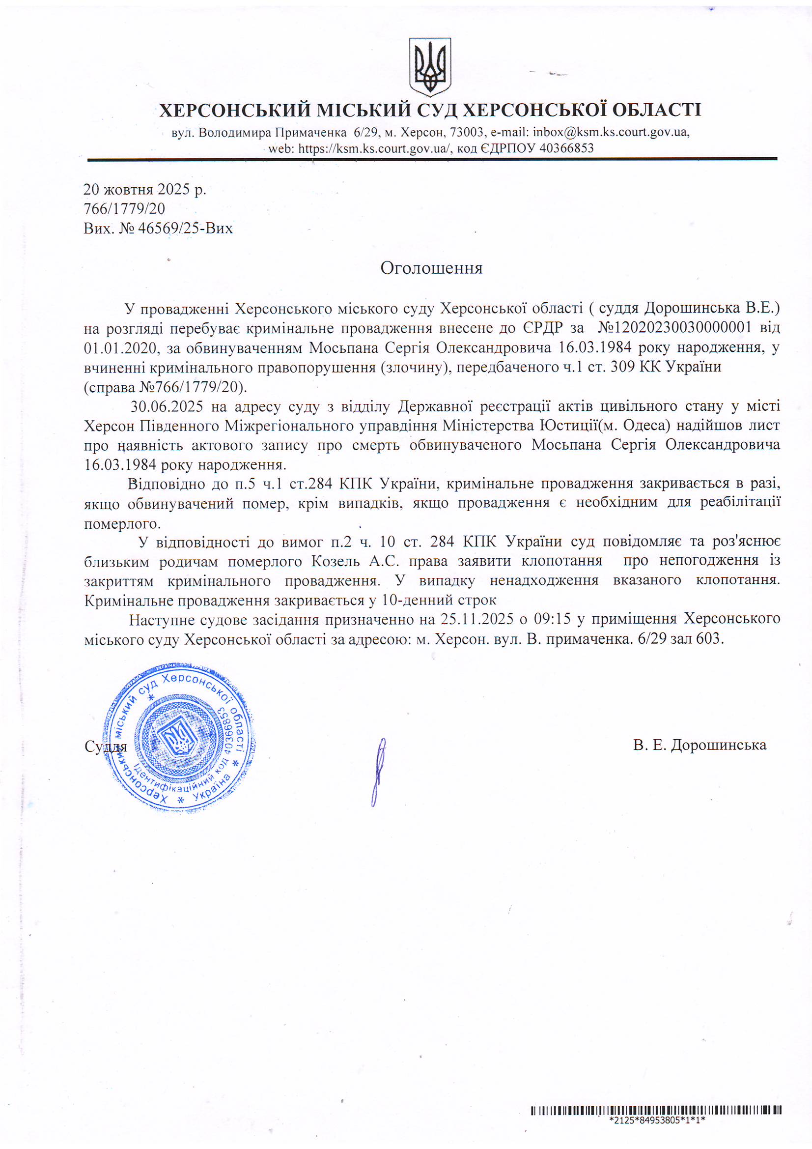 Оголошення про закриття кримінального провадження у відношенні Мосьпана Сергія Олександровича