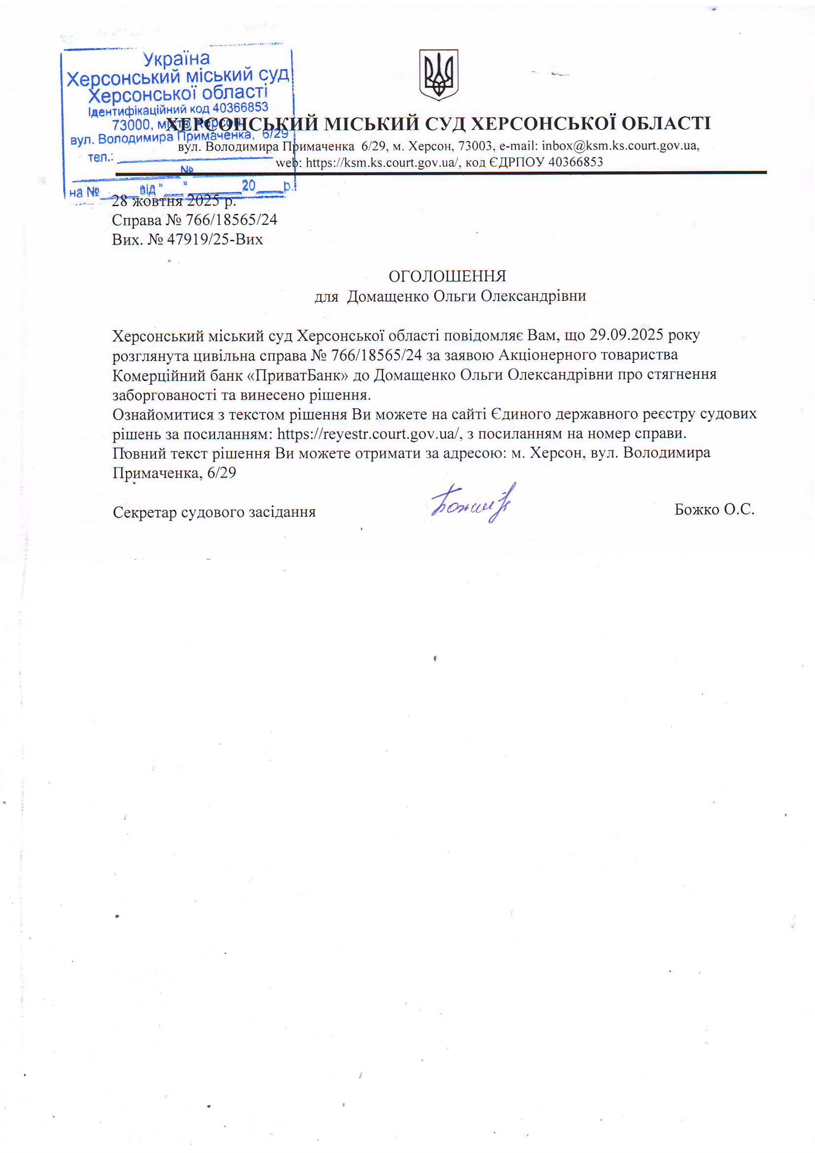 Оголошення для Домащенко Ольги Олександрівни про винесення рішення