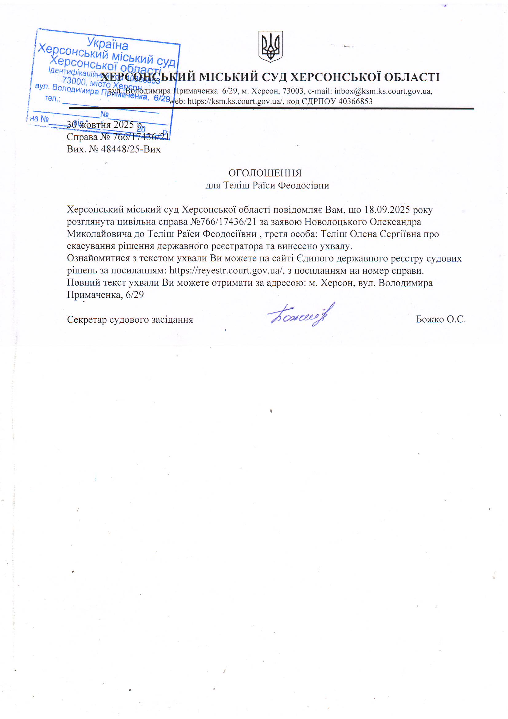 Оголошення для Теліш Раїси Феодосівни про винесення ухвали