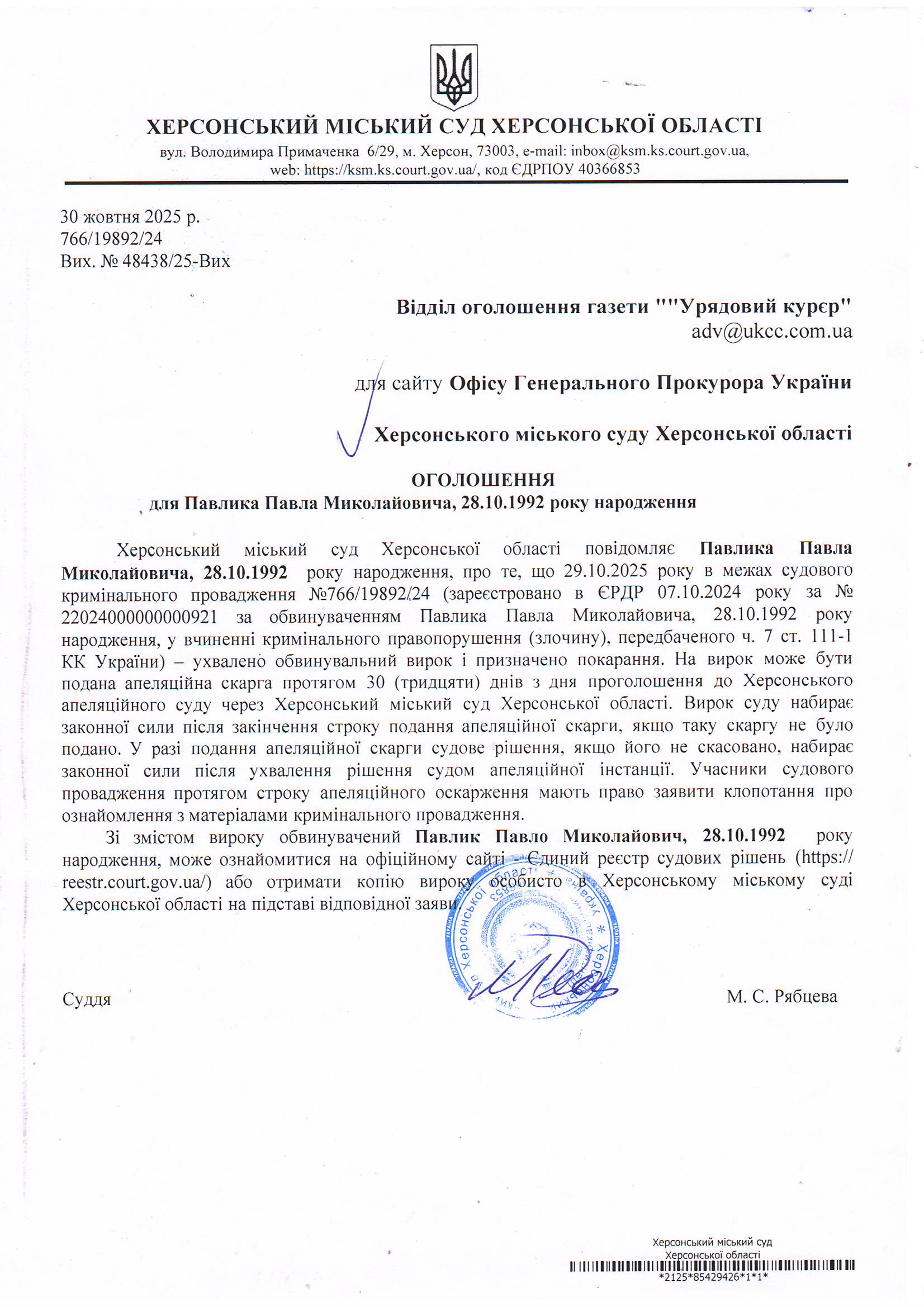 Оголошення для Павлика Павла Миколайовича про винесення вироку