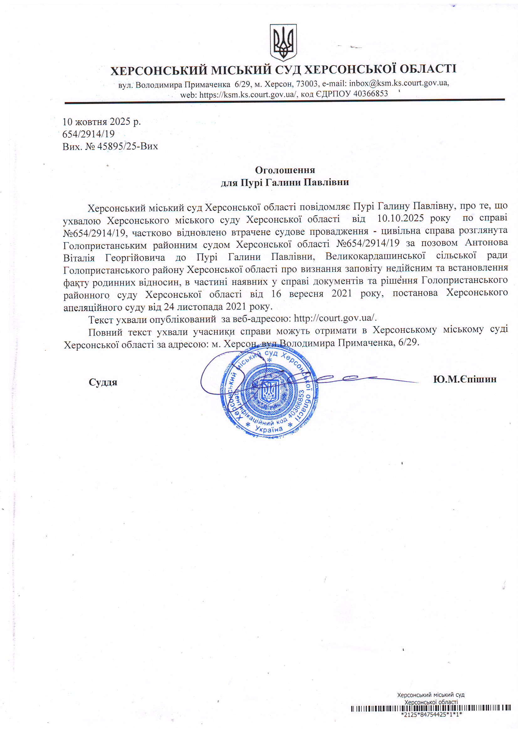 Оголошення про виклик особи в суд та повідомлення про судове рішення