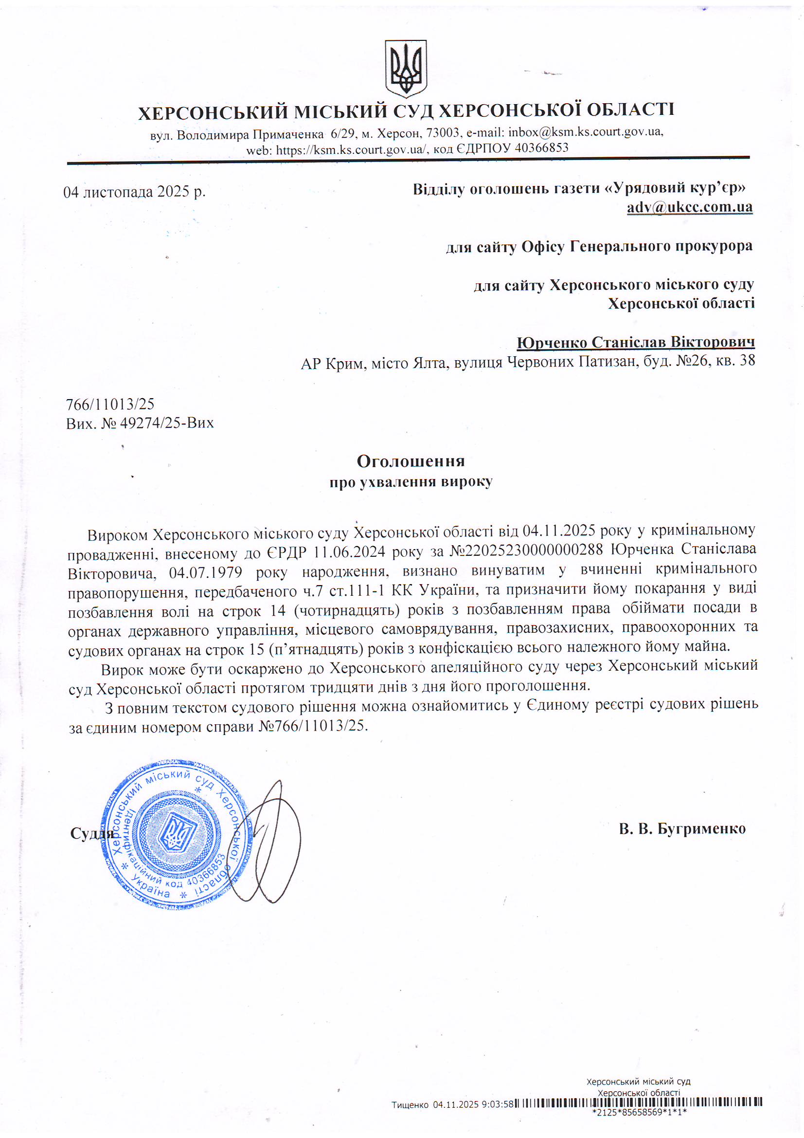 Оголошення для Юрченка Станіслава Вікторовича про ухвалення вироку