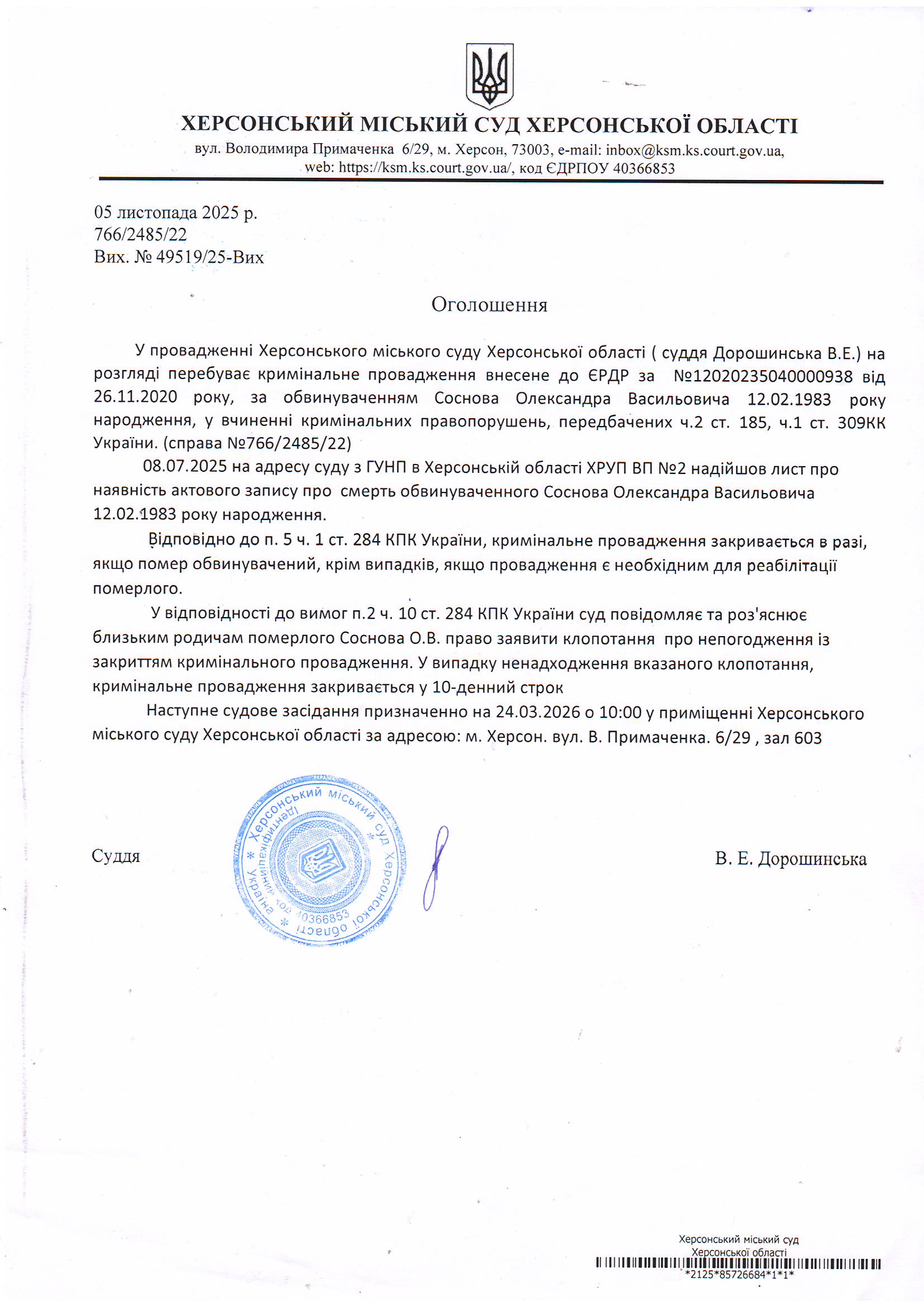 Оголошення про закриття кримінального провадження у відношенні Соснова Олександра Васильовича