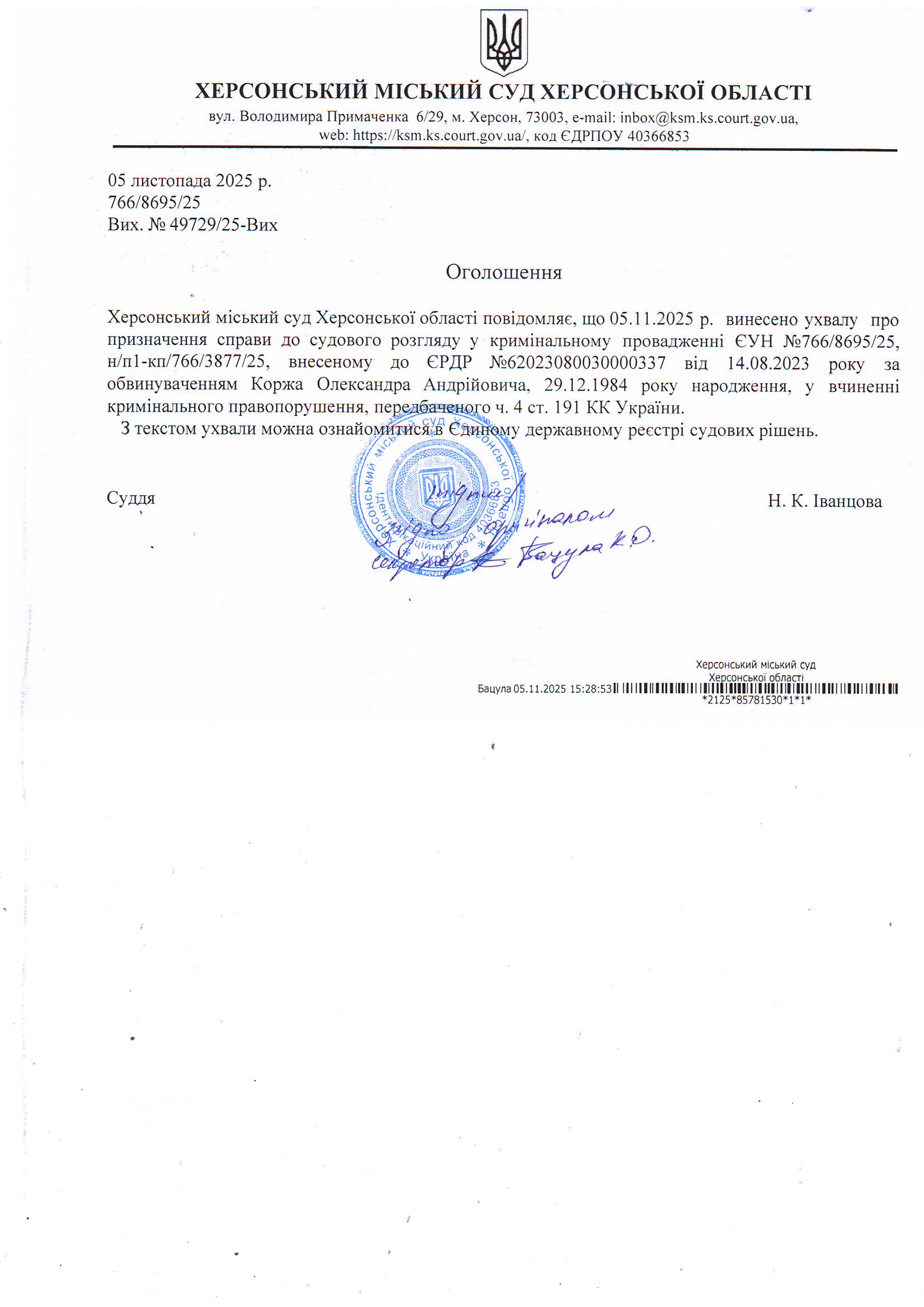 Оголошення про виклик особи в суд та повідомлення про судове рішення