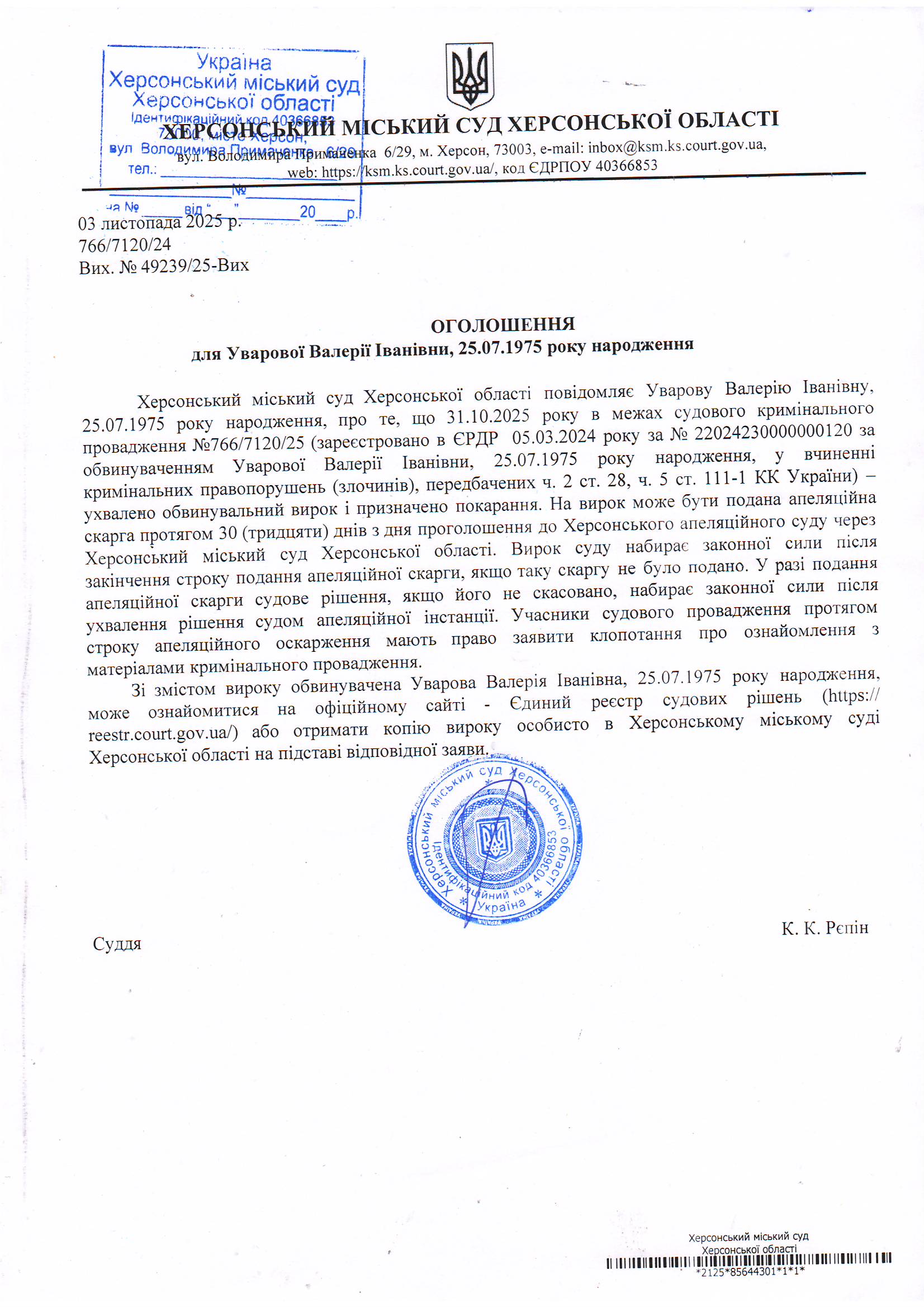 Оголошення для Уварової Валерії Іванівни про винесення вироку