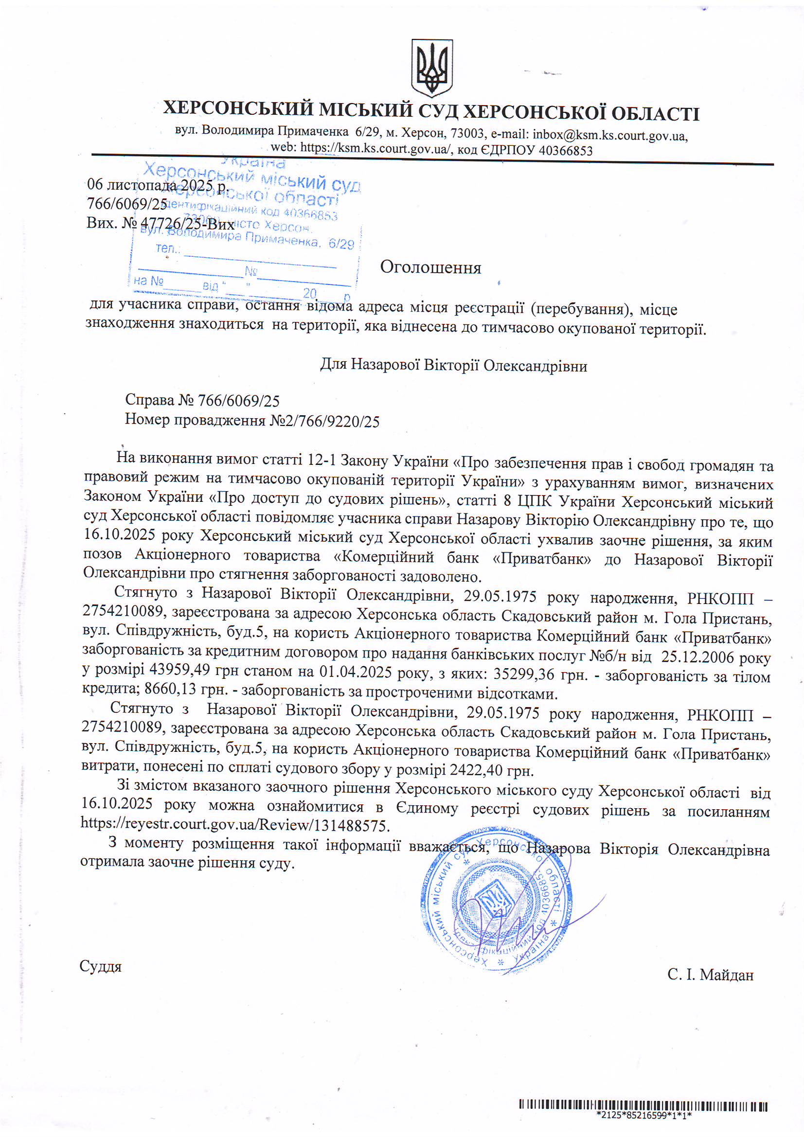 Оголошення для Назарової Вікторії Олександрівни про ухвалення заочного рішення