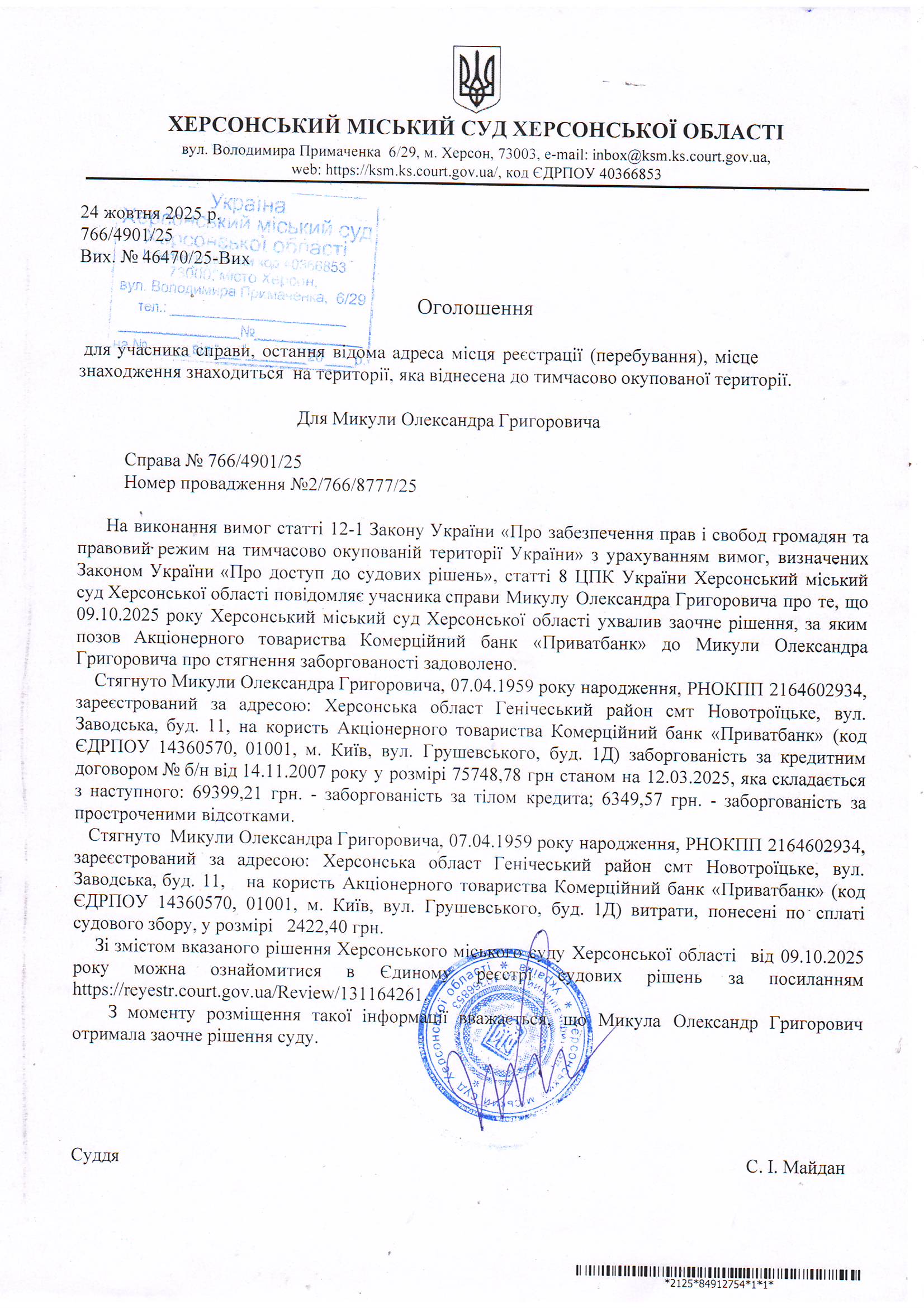 Оголошення для Микули Олександра Григоровича про ухвалення заочного рішення