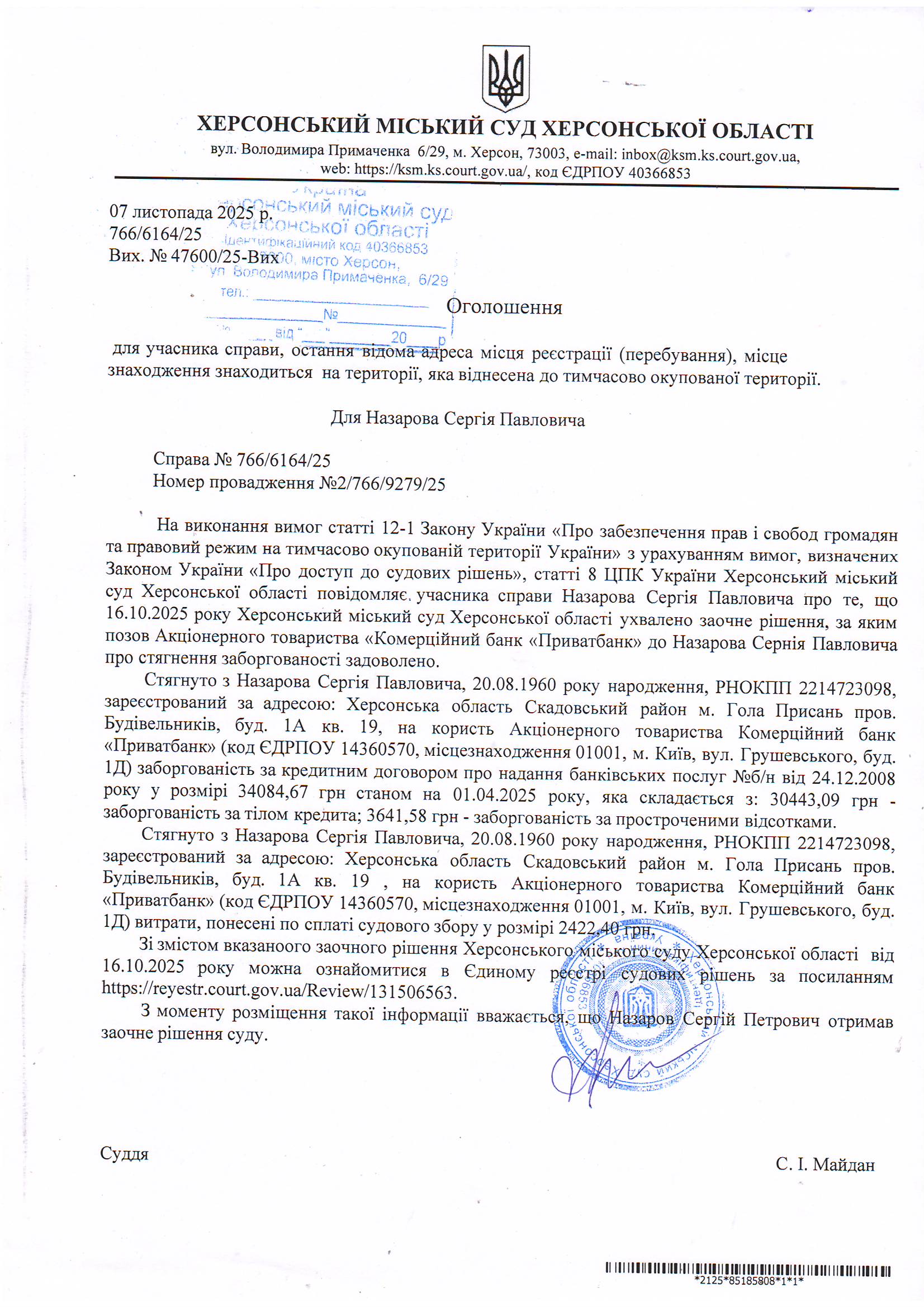 Оголошення для Назарова Сергія Павловича про ухвалення заочного рішення