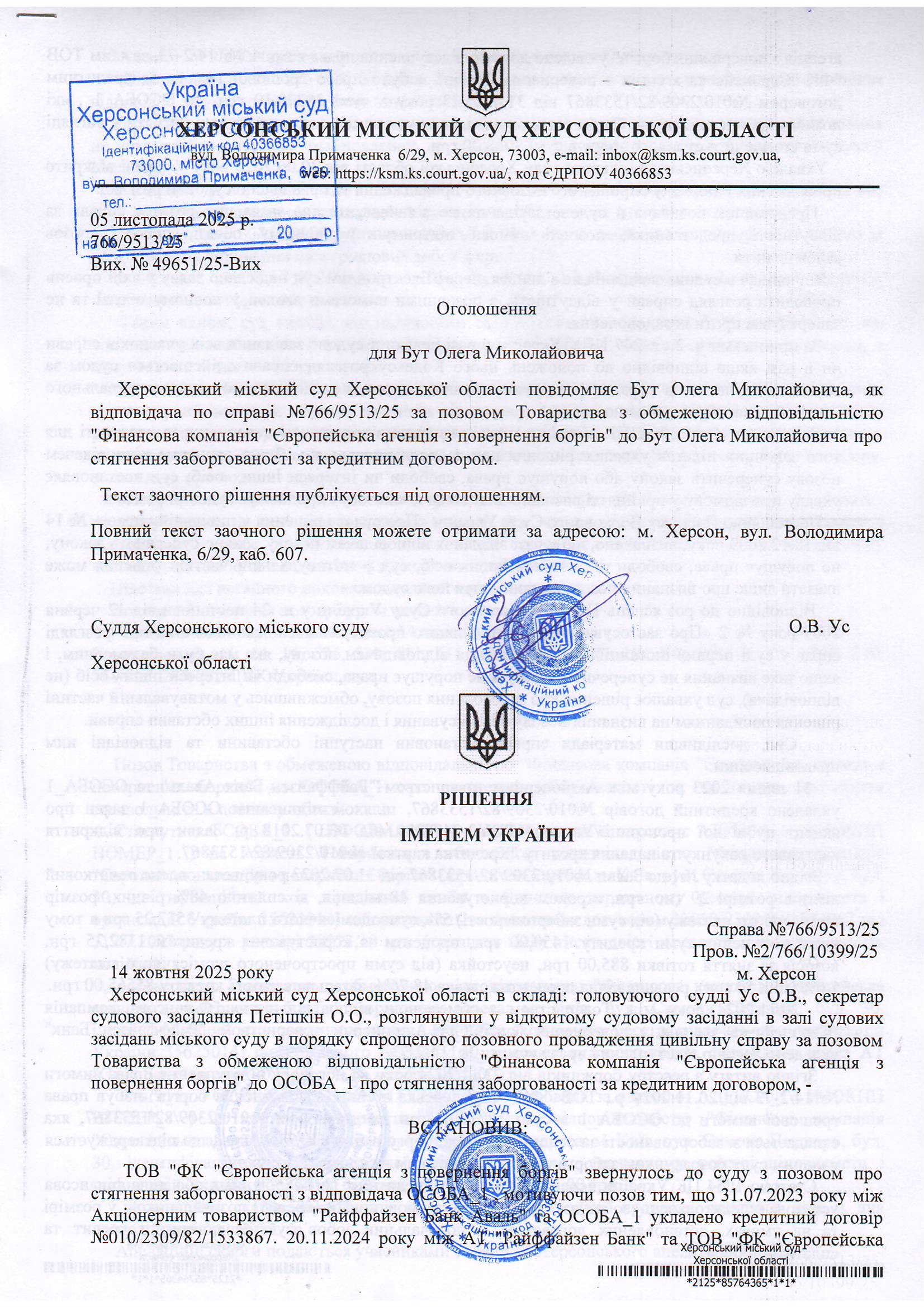 ОГОЛОШЕННЯ, УХВАЛИ ТА ЗАОЧНІ РІШЕННЯ