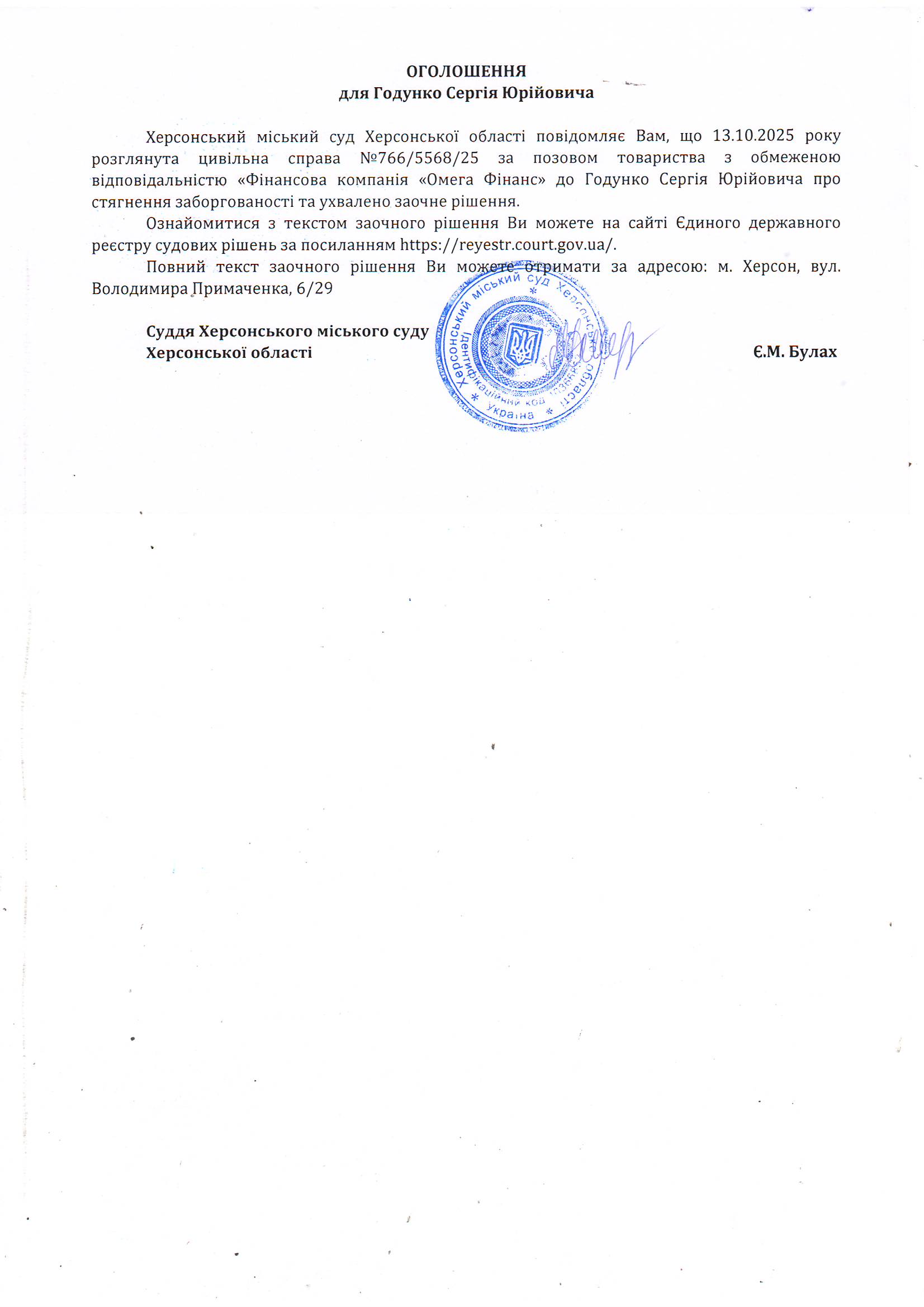 Оголошення для Годунка Сергія Юрійовича про ухвалення заочного рішення