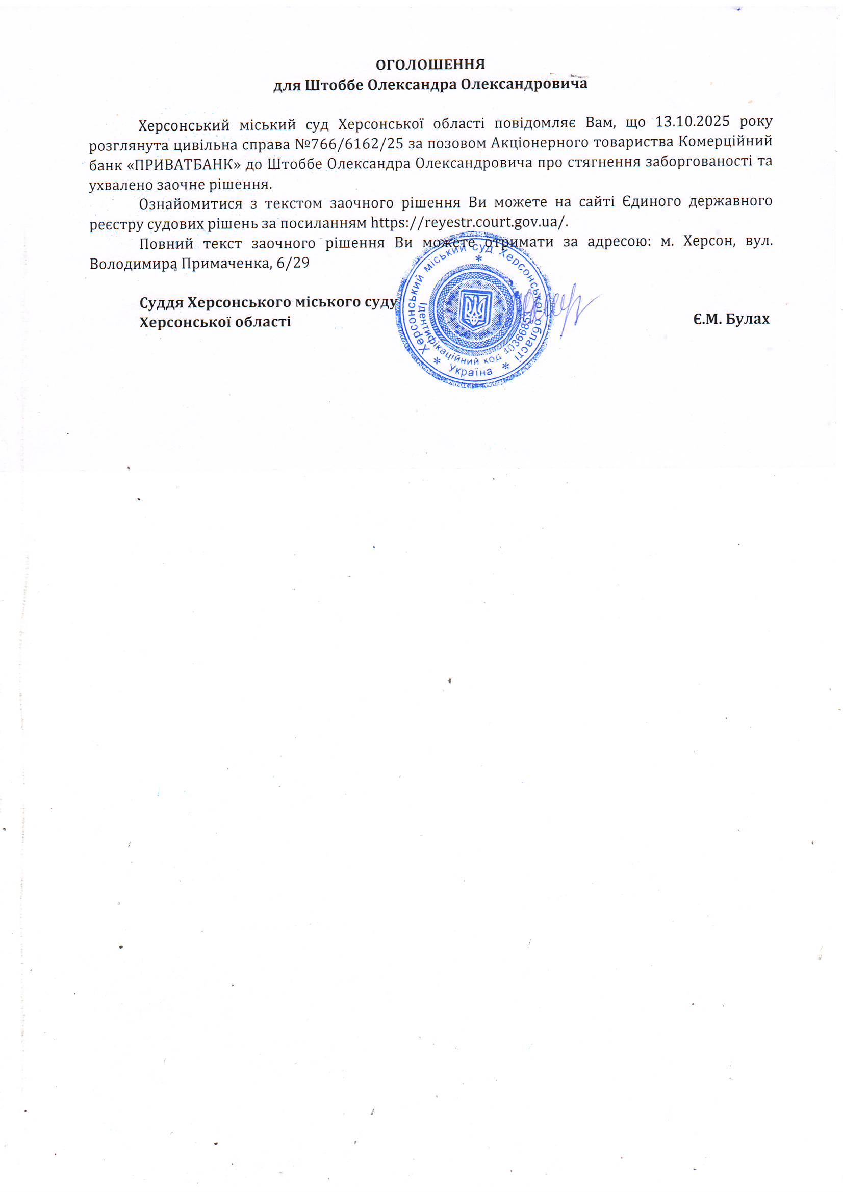 Оголошення для Штоббе Олександра Олександровича про ухвалення заочного рішення