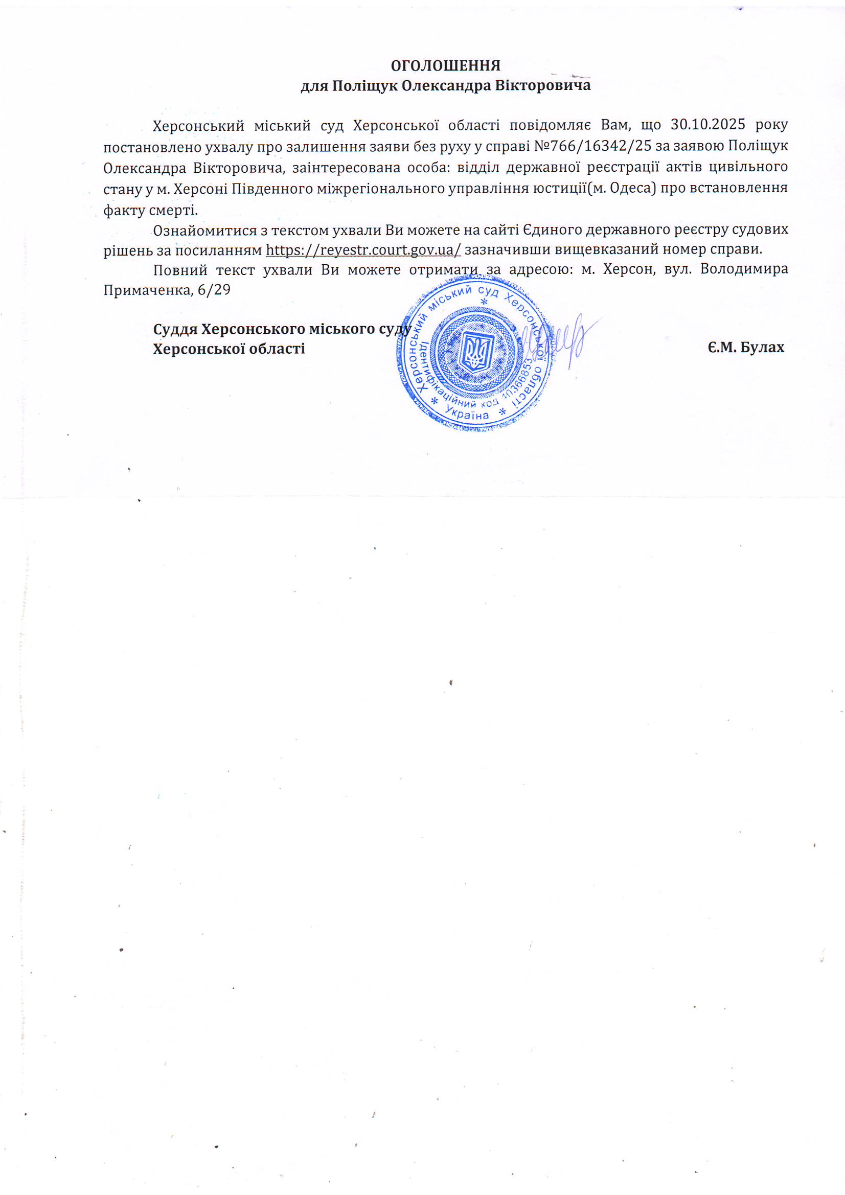 Оголошення для Поліщука Олександра Вікторовича про постановлення ухвали