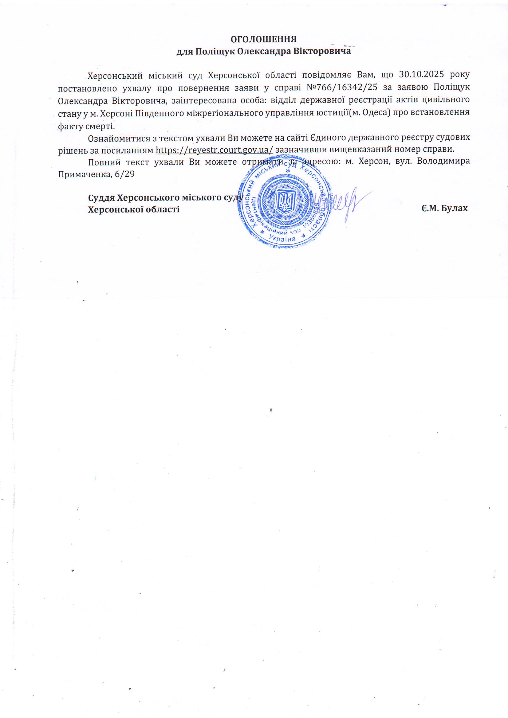 Оголошення для Поліщука Олександра Вікторовича про постановлення ухвали