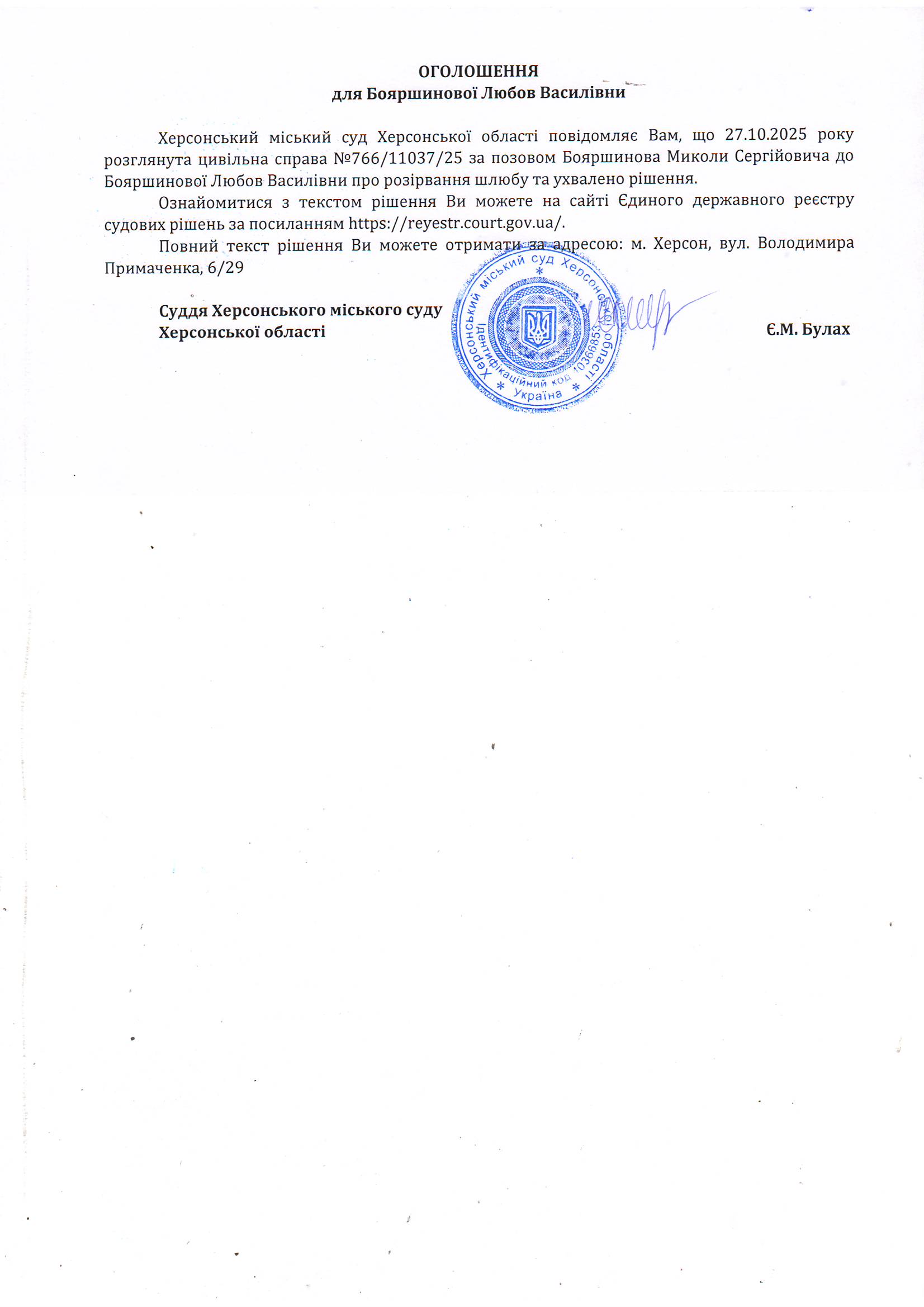Оголошення для Бояршинової Любові Василівни про ухвалення рішення