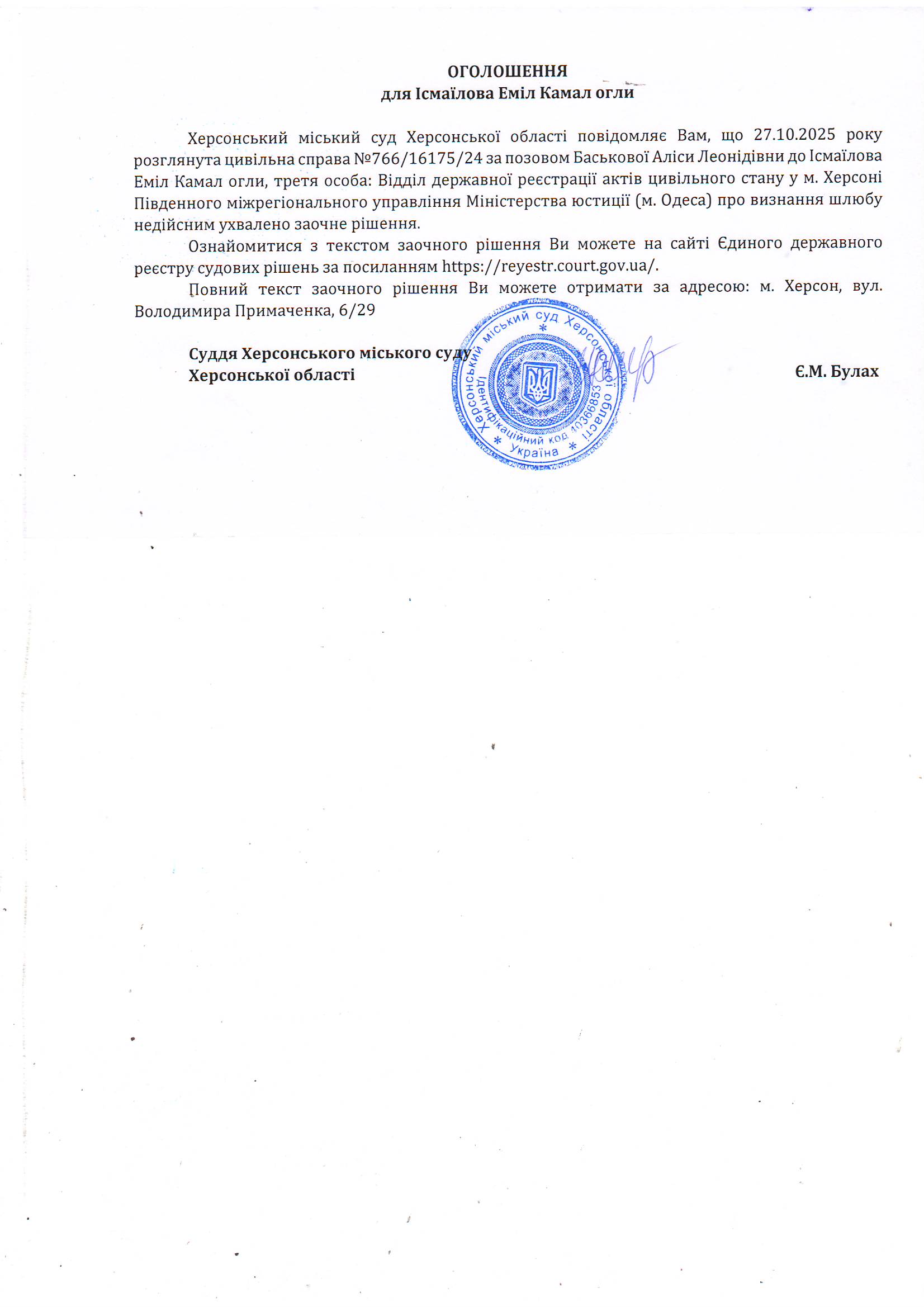 Оголошення для Ісмаїлова Еміл Камал огли про ухвалення заочного рішення