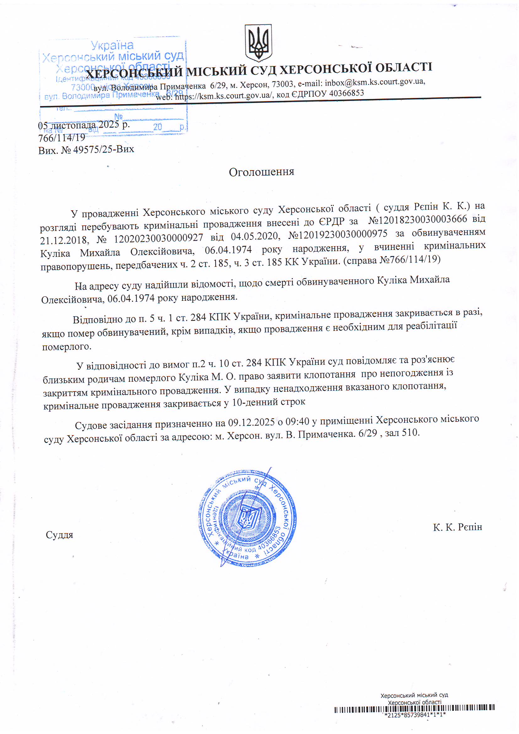 Оголошення про закриття кримінального провадження у відношенні Куліка Михайла Олексійовича