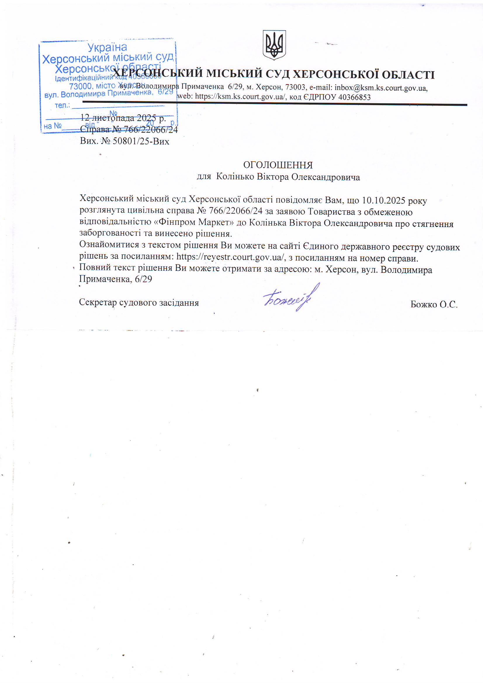 Оголошення для Колінька Віктора Олександровича про винесення рішення