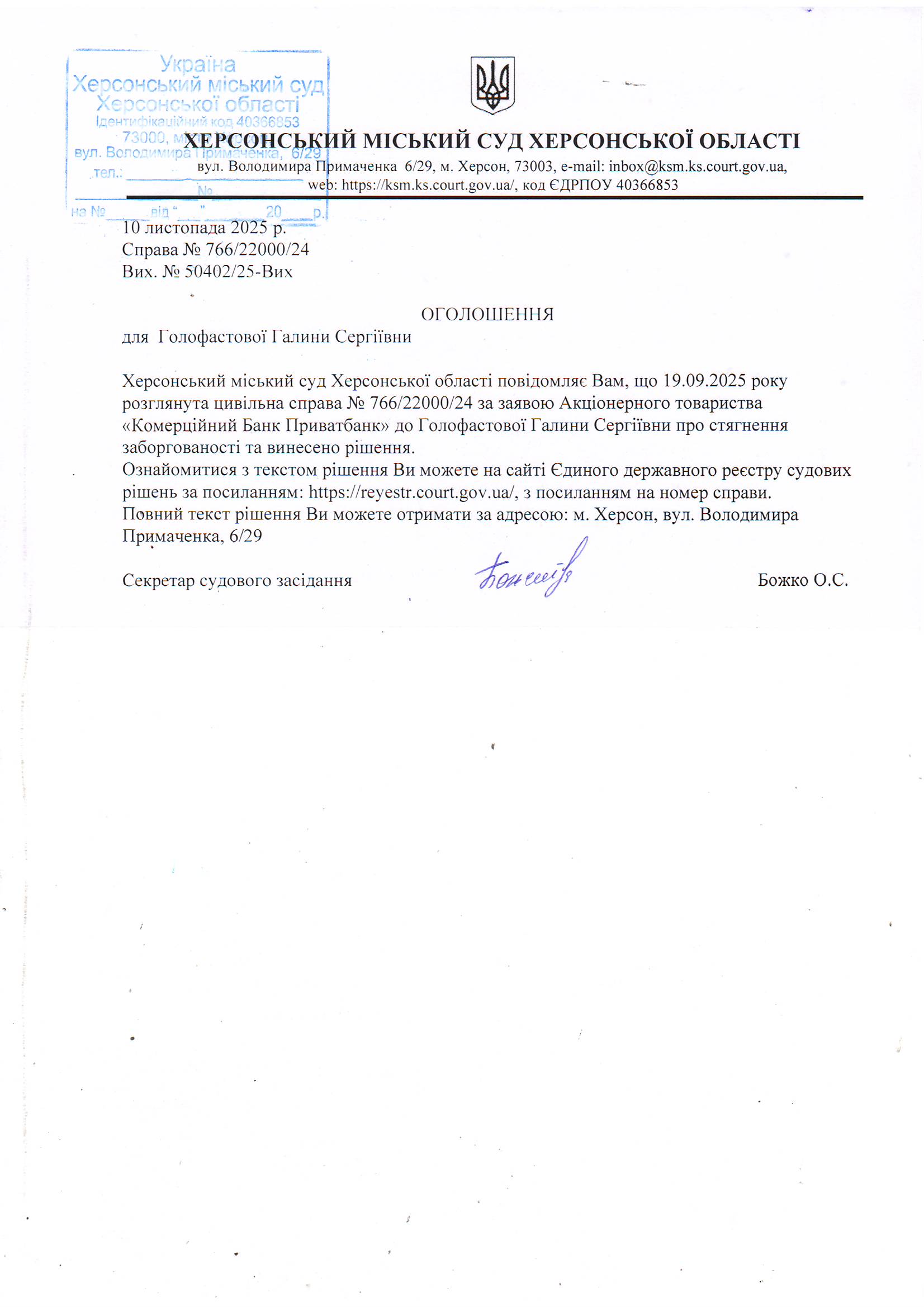 Оголошення для Голофастової Галини Сергіївни про винесення рішення
