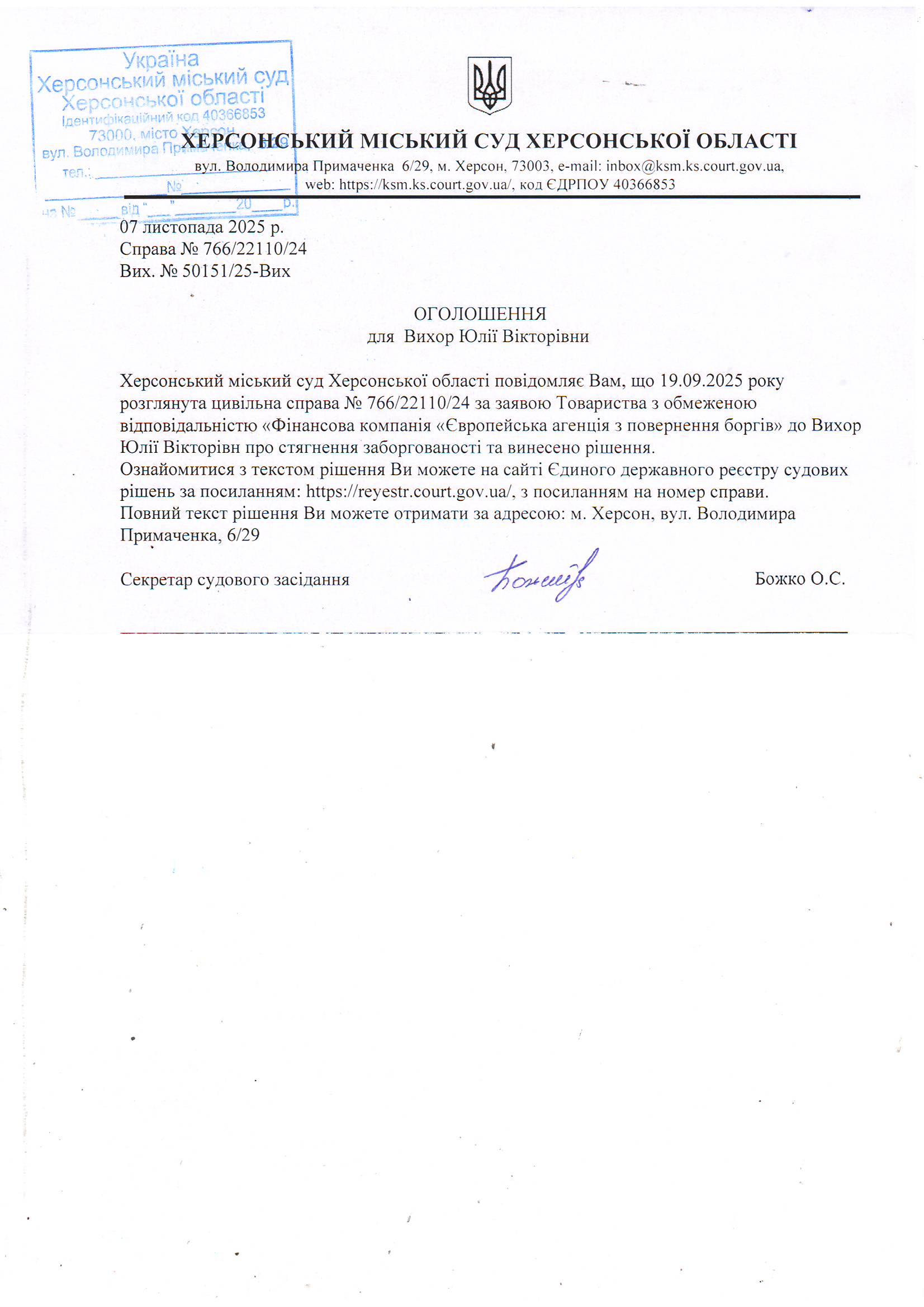 Оголошення для Вихор Юлії Вікторівни про винесення рішення